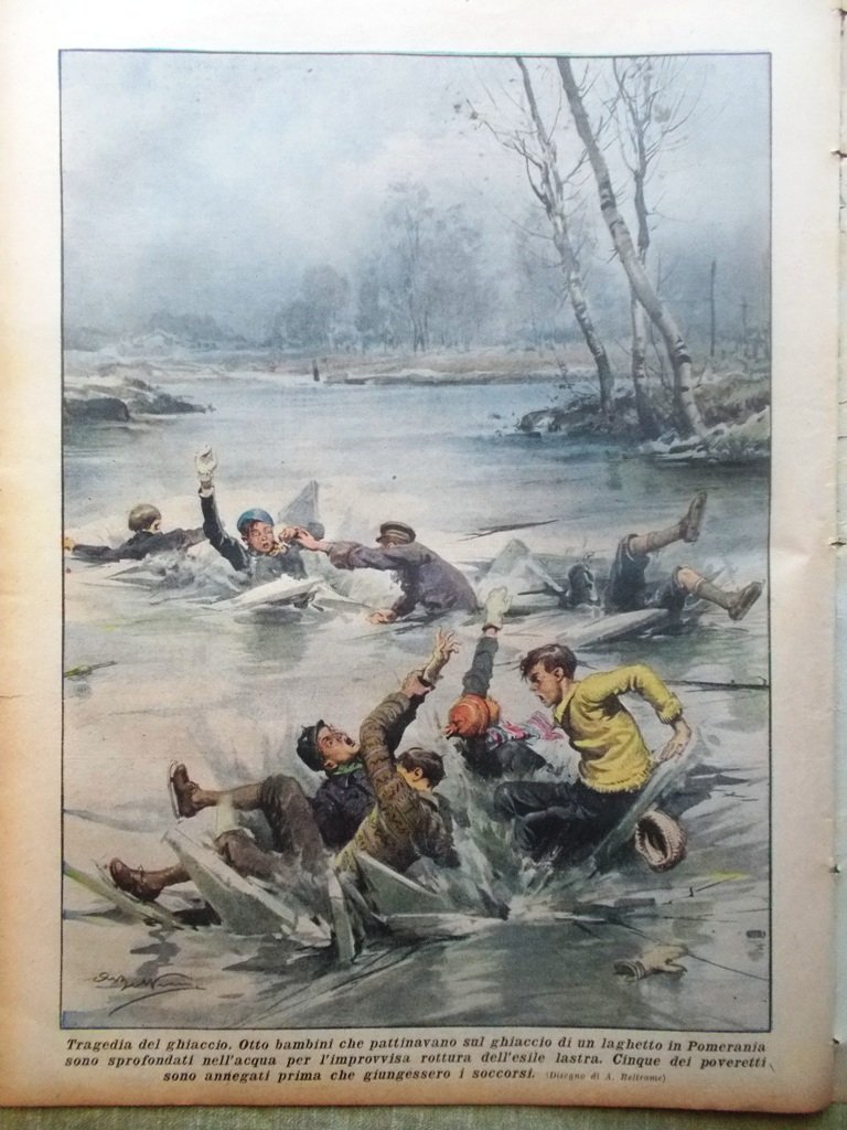 Tragedia del ghiaccio. Otto bambini che pattinavano sul ghiaccio di un laghetto in Pomerania sono sprofondati nell'acqua per l'improvvisa rottura dell'esile lastra. Cinque sono annegati (Achille Beltrame)