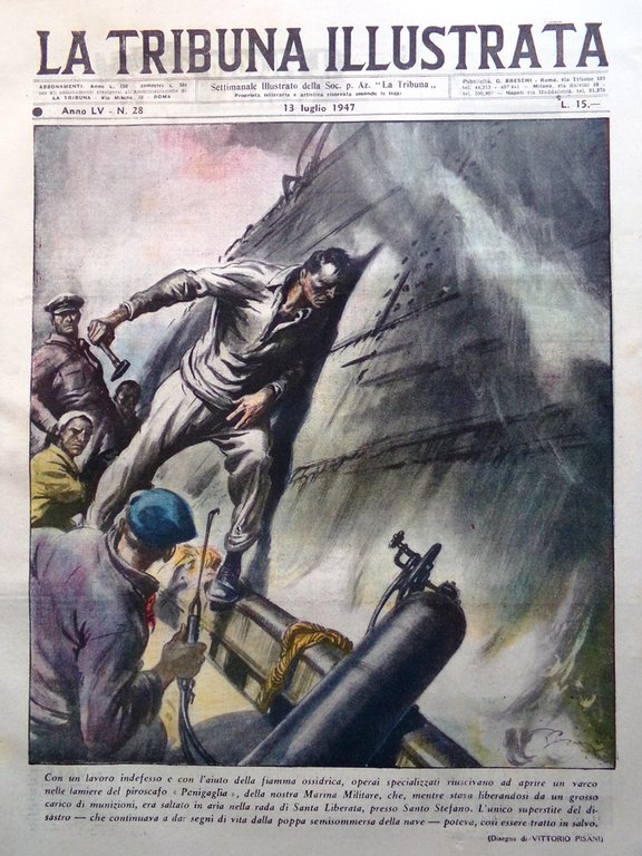 Con un lavoro indefesso e con l'aiuto della fiamma ossidrica, operai specializzati riuscivano ad aprire un varco nelle lamiere del piroscafo "Panigaglia", della nostra Marina Militare, che, mentre stava liberandosi da un grosso carico di munizioni, era saltato in aria nella rada di Santa Liberata, presso Santo Stefano. L'unico superstite del disastro, che continuava a dar segni di vita dalla poppa semisommersa della nave, poteva così essere tratto in salvo (disegno di Vittorio Pisani)