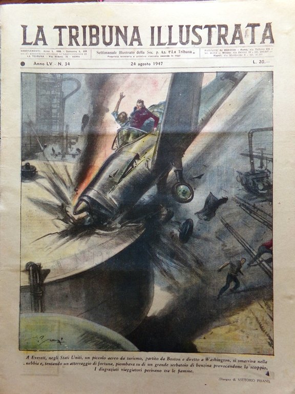 A Everett, negli Stati Uniti, un piccolo aereo da turismo, partito da Boston e diretto a Washington, si smarriva nella nebbia e, tentando un atterraggio di fortuna, piombava su di un grande serbatoio di benzina provocandone lo scoppio. I disgraziati viaggiatori perivano tra le fiamme (disegno di Vittorio Pisani)
