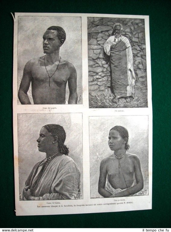 Rara Incisione Estratta da Rivista d'Epoca del 1885 1885 - Tipi Abissinesi: uomo del popolo un santone donna di Gondar una giovinetta (disegni di G. Cavallotti) Dimensioni 23x34cm II1885-069 Qualora vogliate delle scansioni migliori contattateci, soddisferemo ogni vostra richiesta. Paypal Carta di credito Bonifico bancario Accuratamente adagiate su un cartoncino e protette da pellicola trasparente rigida il tutto viene inserito dentro plico di adeguate dimensioni per proteggerne l'integrità