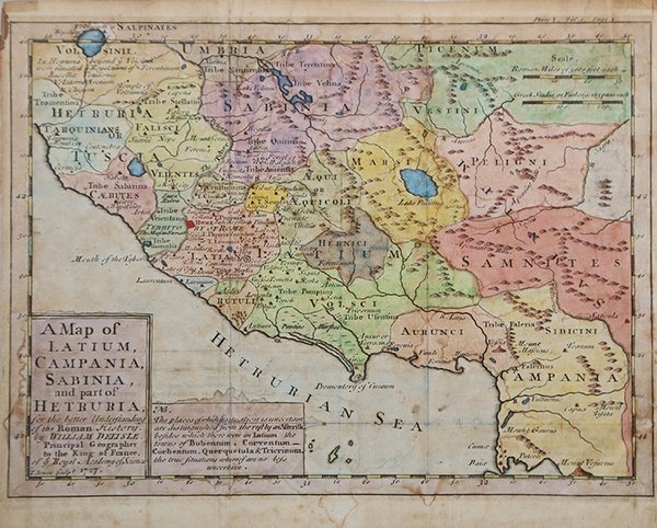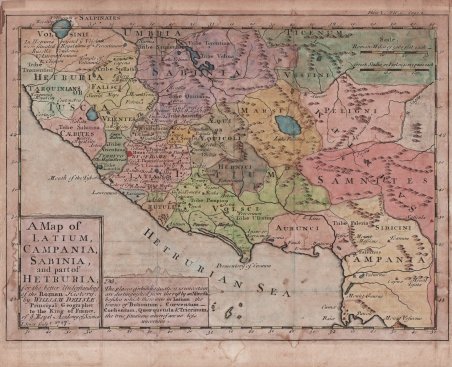 Mappa storica del Lazio che si estende a sud all'intero Golfo di Gaeta. Molto dettagliata, suddivisa in varie zone contrassegnta dai nomi delle antiche popolazioni. La carta, basata sulla mappa di G. De L'Isle, tratta dal "A New General Atlas" di Senex.Acquaforte, finemente oclorata a mano, lieve gora d'acqua nella parte inferiore, per il resto in buono stato di conservazione. Mappa storica del Lazio che si estende a sud all'intero Golfo di Gaeta. Molto dettagliata, suddivisa in varie zone contrassegnta dai nomi delle antiche popolazioni. La carta, basata sulla mappa di G. De L'Isle, tratta dal "A New General Atlas" di Senex.Acquaforte, finemente oclorata a mano, lieve gora d'acqua nella parte inferiore, per il resto in buono stato di conservazione. Cfr.