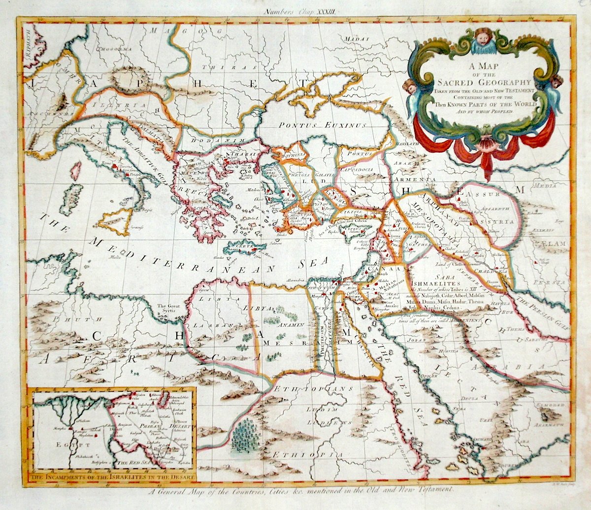 Incisione in rame, finemente colorata a mano, mm 370x425. Cartiglio decorato a colori. Si tratta di una mappa di tutti i luoghi menzionati nei testi sacri cristiani. R. W. Seale fu incisore ed editore di mappe attivo a Londra attorno alla metà del XVIII secolo. <BR>Ottimo esemplare con minimi difetti restaurati al margine destro. <BR>