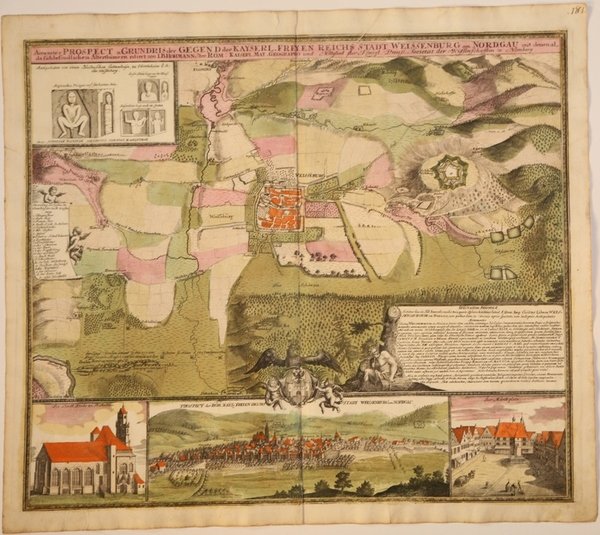 Accurata pianta prospettica dell'area territoriale di Weissenburg - Baviera, con una legenda dei principali monumenti. Sulla destra, una nota storica sulla fondazione della città e dei suoi più antichi monumenti. In basso, una graziosa veduta prospettica della città,e ai lati sono raffigurati la chiesa cittadina evangelica di S. Andrea e il Municipio. La carta fu realizzata da Homann per il suo Grosser Atlas. ' Johann Baptist Homann è stato un geografo e cartografo tedesco; nel 1702 fondò la sua casa editrice. Homann acquisì fama come uno dei principali cartografi tedeschi, e nel 1715 fu nominato geografo imperiale dall'imperatore Carlo VI. Nello stesso anno fu anche nominato membro dell'Accademia Prussiana delle Scienze a Berlino. Nel 1716 Homann pubblicò il suo capolavoro Grosser Atlas ueber die ganze Welt. Numerose mappe furono redatte in collaborazione con l'incisore Christoph Weigel. Homann morì a Norimberga nel 1724. Gli successe suo figlio Johann Christoph (1703-1730). L'azienda continuò dopo la sua morte come azienda degli eredi Homann, gestita da Johann Michael Franz e Johann Georg Ebersberger. Dopo successivi cambiamenti nella gestione, l'azienda si sciolse nel 1852. Perspective plan of the Weissenburg - Bavaria area, with a legend of the main monuments. On the right, an historical note of the foundation of the city and its oldest monuments.Below, a graceful perspective view of the city, and on the sides are depicted the evangelical city church of St. Andrew and the Town Hall. The map was made by Homann for his Grosser Atlas. Johann Baptist Homann was a German geographer and cartographer; in 1702 he founded his own publishing house. Homann acquired renown as a leading German cartographer, and in 1715 was appointed Imperial Geographer by Emperor Charles VI. In the same year he was also named a member of the Prussian Academy of Sciences in Berlin. In 1716 Homann published his masterpiece Grosser Atlas ueber die ganze Welt; numerous maps were drawn up in cooperation with the engraver Christoph Weigel the Elder. Homann died in Nuremberg in 1724 and was succeeded by his son Johann Christoph (1703-1730). The company carried on upon his death as Homann heirs company, managed by Johann Michael Franz and Johann Georg Ebersberger. After subsequent changes in management the company folded in 1852. ' Etching with fine original colour, good condition. Cfr.