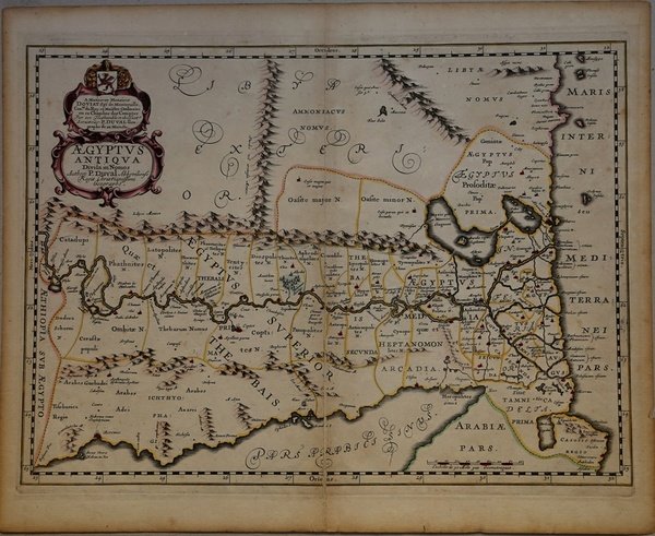Orientata con il Nord a destra, la mappa raffigura nel dettaglio la regione compresa tra la valle del Nilo e il Mar Rosso. Dall'Atlas MajorDoppio cartiglio, uno per il titolo e uno per la dedica in francese a "A Monsieur Monsieur Doviat Sgr. de Montreuille, Con.er du Roy, et Maistre Ordinaire en sa Chambre des Comptes Par son Très humble et obéisant Serviteur P. Duval Géographe de sa Maiesté". Johannes Janssonius, figlio dell'editore di Arnhem Jan Janssen, sposò Elisabeth Hondius, figlia di Jodocus Hondius, ad Amsterdam nel 1612. Dopo il suo matrimonio, si stabilì in questa città come libraio ed editore di materiale cartografico. Nel 1618 si stabilì ad Amsterdam accanto alla libreria di Willem Jansz. Blaeu, entrando in una seria competizione. Le sue attività non riguardavano solo la pubblicazione di atlanti e libri, ma anche di mappe singole e un vasto commercio di libri con filiali a Francoforte, Danzica, Stoccolma, Copenaghen, Berlino, Koningsbergen, Ginevra e Lione. Nel 1631 iniziò a pubblicare atlanti insieme a Henricus Hondius. Nei primi anni 1640 Henricus Hondius lasciò l'attività di pubblicazione di atlanti completamente a Janssonius. La concorrenza con Joan Blaeu, figlio e successore di Willem, nella produzione di atlanti spinse Janssonius ad ampliare il suo Atlas Novus finalmente in un'opera di sei volumi, in cui furono inseriti un atlante marino e un atlante del Vecchio Mondo. Dopo la morte di Joannes Janssonius, il negozio e la casa editrice furono continuati dagli eredi sotto la direzione di Johannes van Waesbergen (c. 1616-1681), genero di Joannes Janssonius. Le matrici degli atlanti di Janssonius furono in seguito vendute a Schenk e Valck. Map oriented with north on the right. It presents a colorful and detailed picture of the region between the fertile Nile River valley and the Red Sea. The map is adorned with a strapwork title cartouche with a credit to Pierre du Val. Includes a note in a decorative cartouche: "A Monsieur Monsieur Doviat Sgr. de Montreuille, Con.er du Roy, et Maistre Ordinaire en sa Chambre des Comptes Par son Très humble et obéisant Serviteur P. Duval Géographe de sa Maiesté".Published in Janssonius' Atlas Major. Johannes Janssonius (Arnhem, 1588-1664), son of the Arnhem publisher Jan Janssen, married Elisabeth Hondius, daughter of Jodocus Hondius, in Amsterdam in 1612. After his marriage, he settled down in this town as a bookseller and publisher of cartographic material. In 1618 he established himself in Amsterdam next door to Blaeu’s book shop. He entered into serious competition with Willem Jansz. Blaeu. His activities not only concerned the publication of atlases and books, but also of single maps and an extensive book trade with branches in Frankfurt, Danzig, Stockholm, Copenhagen, Berlin, Koningsbergen, Geneva, and Lyon. In 1631 he began publishing atlases together with Henricus Hondius. In the early 1640s Henricus Hondius left the atlas publishing business completely to Janssonius. Competition with Joan Blaeu, Willem’s son and successor, in atlas production prompted Janssonius to enlarge his Atlas Novus finally into a work of six volumes, into which a sea atlas and an atlas of the Old World were inserted. After the death of Joannes Janssonius, the shop and publishing firm were continued by the heirs under the direction of Johannes van Waesbergen (c. 1616-1681), son-in-law of Joannes Janssonius. The copperplates from Janssonius’s atlases were afterwards sold to Schenk and Valck. Cfr. Van der Krogt 1