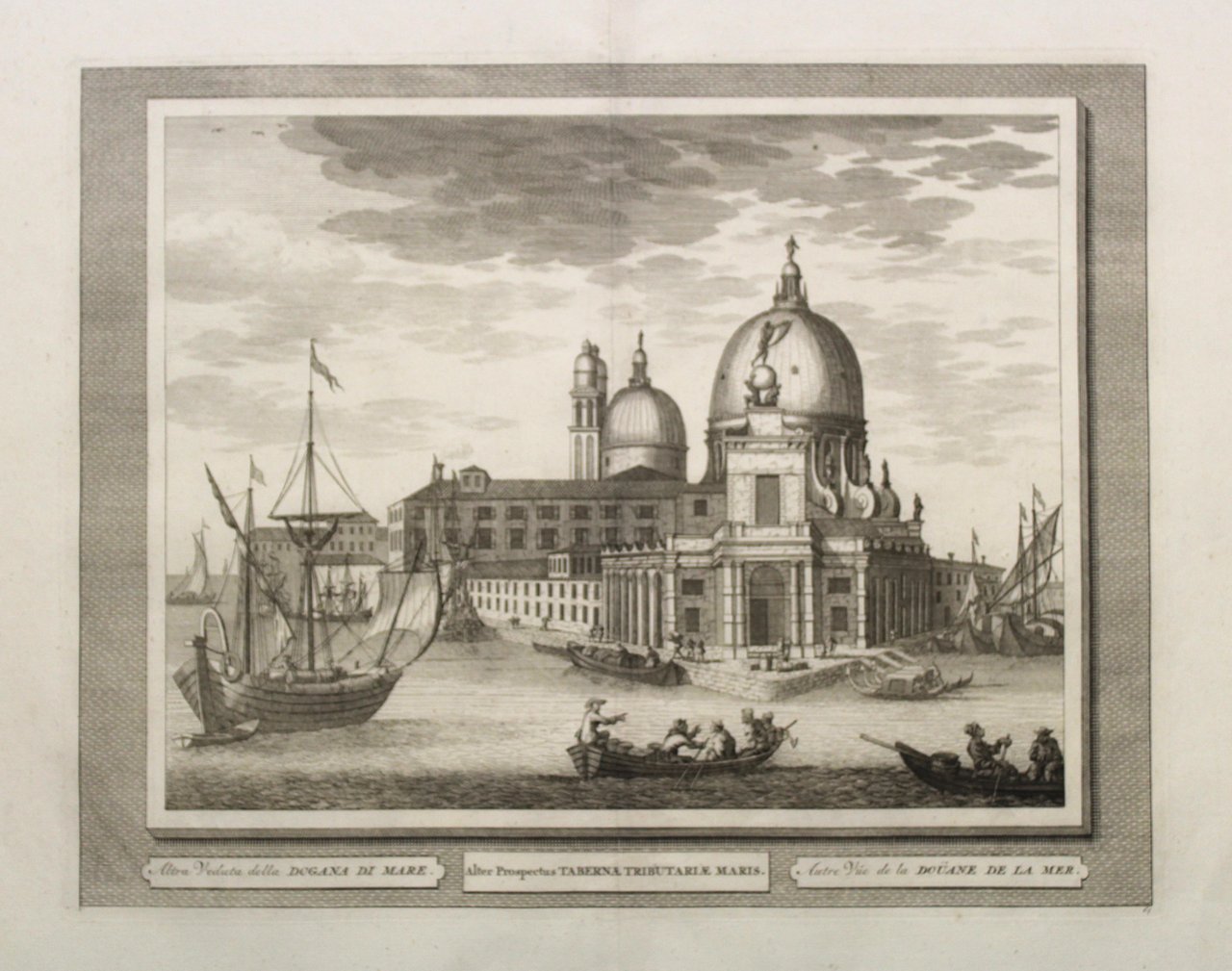 Altra veduta della Dogana di mare (titolo ripetuto in latino al centro e francese a d.)