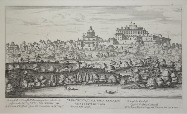 Veduta di Castel Gandolfo presa dal lago. Papa Alessandro VII amava particolarmente la residenza pontificia di Castel Gandolfo, che fece ampliare e restaurare dal Bernini. Soggiornò regolarmente a Castel Gandolfo due volte l’anno, in primavera e in autunno, per periodi variabili da 20 giorni ad un mese. Esemplare di primo stato, avanti la numerazione, tratto da ' Il nuovo teatro delle fabriche, et edificii, in prospettiva di Roma moderna, sotto il felice pontificato di N. S. papa Alessandro VII. Opera in tre volumi, edita da Giovanni Giacomo de Rossi tra il 1665 e il 1669, illustra le fabbriche realizzate o ampliate durante il pontificato di Alessandro VII Chigi, mentre il III si riferisce alle chiese restaurate dal pontefice Clemente IX. L'opera aveva lo scopo di divulgare la nuova immagine di Roma, con i suoi palazzi, chiese e giardini, secondo un progetto unitario di espansione urbana, in sintonia con i criteri del colto e raffinato Fabio Chigi: il papa, infatti, decise di aprire nuove strade, di abbellire con fontane e monumenti la città, anche a dimostrazione della potenza finanziaria e culturale della sua famiglia. Prima di allora l'incisione di veduta a Roma, che pure aveva prodotto numerose serie dì stampe da Etienne Dupérac a Giacomo Lauro, si era interessata principalmente alla ripresa della città antica. Bisognerà attendere proprio il completamento dei rinnovamenti urbanistici e delle realizzazioni architettoniche dei papi seicenteschi, per assistere alla diffusione di raccolte dedicate alla città moderna. Giovan Battista Falda ha contribuito, con la vasta serie di incisioni di vedute, a divulgare un'immagine della città di Roma legata alla magnificenza e munificenza dei Papi seicenteschi: città ricca di chiese, palazzi, giardini che si affiancavano ai resti del glorioso passato. L'incisore dedicò tutta la sua pur breve vita a creare, attraverso precise ed attente vedute prospettiche, piante e stampe su avvenimenti cittadini, canonizzazioni, ingressi di pontefici e reali stranieri, un grosso affresco unitario che celebrasse nel suo insieme la nuova grandezza raggiunta dalla Roma moderna, grazie soprattutto alla geniale e lungimirante opera di papa Alessandro VII Chigi (1655 - 1667). Dopo la morte del Falda, verrà pubblicato, sempre dalla tipografia De Rossi, ' Il quarto libro del nuovo teatro delli palazzi in prospettiva di Roma moderna dato in luce sotto il felice pontificato di nostro signore papa Innocenzo XII, di Alessandro Specchi, edito nel 1699 e naturale prosecuzione della raccolta. Acquaforte, impressa su carta vergata coeva, con margini, in ottimo stato di conservazione. View of Castel Gandolfo from the lake.Pope Alexander VII Chigi (1655-1667) liked to spend from 20 days to a month in Castel Gandolfo at least twice a year, in spring and in autumn. He was particularly sensitive to the beauty of the lake and of the surrounding woodlands which he felt were conducive to meditation and silence. Example in the first state, before the number, taken from ' Il nuovo teatro delle fabriche, et edificii, in prospettiva di Roma moderna, sotto il felice pontificato di N. S. papa Alessandro VII. One of the most important architectural projects of the seventeenth century was the urban renovation of Rome. Under the brilliant leadership of Pope Alessandro VII (1655-1667), Rome dramatically emerged as one of the most modern and beautiful cities of the new Baroque age. Within several decades spacious roadways were constructed, monumental buildings arose, and many public squares appeared with elaborate fountains and monuments. To be sure, this massive undertaking was meant to underline the absolute power of the Papacy but it also brought forth a new flowering of Italian art and architecture. ' The ' Nuovo Teatro ' was initiated in 1665 to depict the new Rome in a series of etchings. What it gave to future generations was a magnificent historical record of views etched by two of Italy's greatest architectural artists. ' The printing and publishing of these important etchings was entrusted to Giacomo de Rossi (1626-1691), the head of the most dominant Roman publishing house. ( Sons and nephews of de Rossi, in fact, continued the publishing house until 1738 when the business was sold to Pope Clement XII to form the basis of the ' Regia Calcografia.) ' Altogether, four sets of ' Nuovo Teatro ' were created during the seventeenth century. Volumes one and two were both published in the year of 1665 and dealt mainly in views of the new piazzas, gardens, terraces and their surrounding buildings. Volume 3 was published in 1669 and concentrated upon the newly constructed churches of Rome. Every plate from the first three sets was both designed and etched by the influential architectural artist, Giovanni Battista Falda (1643-1678). For reasons unknown the fourth and final volume ' Il quarto libro del nuovo teatro delli palazzi in prospettiva di Roma moderna dato in luce sotto il felice pontificato di nostro signore papa Innocenzo XII, (52 etchings) did not appear until 1699. ' It was published by Giacomo's successor, Domenico de Rossi, and featured views of the palaces and stately homes of Rome. Each plate was designed and etched by the famous architect and etcher, Alessandro Specchi (1668-1729). ' Etching, printed on contemporary laid paper, with margins, in good condition. Cfr.