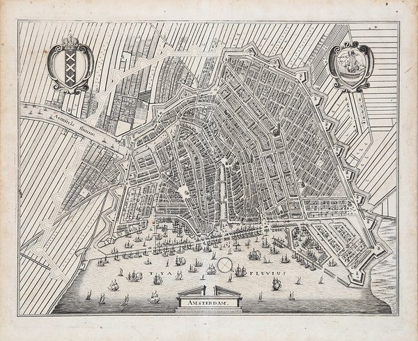 Bella pianta della città di Matthaus Merian. Tavola pubblicata nell'opera "Newe Archontologia Cosmica" di Johann Philip Zabelin, meglio conosciuto con lo pseudonimo di J.L.Gottfried, arricchita dalle tavole di Mattheus Merian. Il "Neuwe Archontologia cosmica, Das ist Beschreibung aller Kayserthumben Königreichen und Republiken der gantzen Welt [.]", viene edito a Francoforte nel 1638 e ristampato in lingua latina nel 1638 e nel 1649 e in lingua tedesca nel 1646 e nel 1695.La stampe di Merian sembrano essere anche stata pubblicata separatamente, e confluirono nel “Theatrum Europaeum” una sorta di giornale sulla storia delle terra, in lingua tedesca, iniziato da Matthäus Merian e proseguito poi da altre editori, che venne pubblicato tra il 1633 e il 1738 [in 21 volumi in quarto]. Matthäus Merian il vecchio (1593-1650) incisore svizzero nativo di Basilea, lavorò a Francoforte dove ebbe modo di lavorare nella bottega fondata da Theodor de Bry. Merian si segnalò, tanto da sposare Maria Magdalena de Bry, figlia di Johann Theodore de Bry, e dal 1625 circa da prendere in mano l'azienda, dandole un notevole incremento ed occupandosi in particolare dello sviluppo dei libri di topografia e di viaggi. Nella tipografia Merian lavorarono anche i figli Kaspar e soprattutto il quotato Matthaeus il giovane, i quali dopo la morte del padre proseguirono con immutato successo la gestione dell'attività che continuò fino al 1727. Nel 1638 Merian stampò la Neuwe Archontologia cosmica, das ist, Beschreibung aller Kaÿserthumben, Königreichen und Republicken der gantzen Welt opera sulla descrizione del Mondo già uscita dieci anni prima con una veste modesta che Merian rivoluzionò arricchendola con 98 tavole alcune delle quali a doppio foglio. L'Archontologia conobbe altre quattro edizioni fino al 1695 con testo o in latino o in tedesco, non omogenee per numero e tipologia di incisioni inserite. Nel 1640 venne pubblicato Itinerarium Italiæ Nov-antiquæ scritto da Martin Zeiller, ristampato nel 1688 col titolo Topographiæ Italiæ. Acquaforte, finemente colorata a mano, in ottimo stato di conservazione. This plate was first used in Johann Ludwig Gottfried, "Neuwe Archontologia Cosmica.", first published by Matthias Merian in 1638, and reissued in numerous later editions. The print seems also to have been published separately.Then it was included in the “Theatrum Europaeum”; was a journal on the history of the German-speaking lands by Matthäus Merian, published between 1633 and 1738 in 21 quarto volumes.The plate shows a bird's-eye view of the city and its fortifications and several ships in the harbour. Matthäus Merian the Elder (1593-1650) Swiss engraver native of Basel, worked in Frankfurt where he was able to work in the workshop founded by Theodor de Bry. Merian distinguished himself, so much so that he married Maria Magdalena de Bry, daughter of Johann Theodore de Bry, and from about 1625 he took over the company, giving it a considerable increase and dealing in particular with the development of topography and travel books. The Kaspar sons and above all the renowned Matthaeus the younger also worked in the Merian typography, who after the death of their father continued with unchanged success the management of the business which continued until 1727. In 1638 Merian printed the Neuwe Archontologia cosmica, das ist, Beschreibung aller Kaÿserthumben, Königreichen und Republicken der gantzen Welt works on the description of the World already published ten years earlier with a modest look that Merian revolutionized by enriching it with 98 tables, some of which are double sheets. The Archontologia went through four other editions up to 1695 with text either in Latin or in German, not homogeneous in terms of the number and type of engravings inserted. In 1640 Itinerarium Italiæ Nov-antiquæ written by Martin Zeiller was published, reprinted in 1688 with the title Topographiæ Italiæ. Etching, with fine later hand colour, very good condition. Cfr.