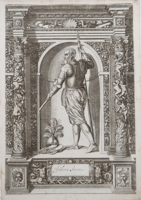 Ritratto di Andrea Doria, ammiraglio, politico e nobile della Repubblica di Genova. Bulino, 1601, da Giovan Battista Fontana. Ottima prova, impressa su carta vergata coeva, con margini, in buono stato di conservazione. Testo latino al verso, prima edizione. Tavola tratta da Augustissimorum Imperatorum . regum . verissimae immagina… (noto anche come Armamentarium Heroicum), il catalogo della collezione di armi dell'Arciduca Ferdinando II, conservato nel castello di Ambras; venne pubblicato per la prima volta a Innsbruck nel 1601. Fu illustrato con un frontespizio e 125 ritratti di principi europei in armatura completa, inseriti in una ricca cornice ornamentale. Le lastre furono incise da Domenico Custos su disegno di Giovanni Battista Fontana. Ogni tavola era accompagnata da un breve testo biografico scritto da Jacob Schrenk von Notzing. Una traduzione tedesca del libro (di J. E. Noyse von Campenhouten) è stata pubblicata nel 1603 con il titolo Der Aller Durchleuchtigisten und Grossmächtigen Kayser, Durchleuchtigisten unnd Großmächtigen Königen[.]. Una terza edizione, comprendente 123 tavole, fu stampata a Innsbruck nel 1605. Portrait of Andrea Doria, full-length, in profile, facing left, wearing armour, holding a spear in his right hand, and a baton in his left; within a niche, flanked on either side by decorated Corinthian columns. Engraving, circa 1601. A fine impression, printed on contemporary laid paper, with margins, good condition. Latin text on verso, first edition. Plate from Augustissimorum Imperatorum . regum. verissimae imagines… (also known as Armamentarium Heroicum), the catalogue of the arms collection Archduke Ferdinand II kept at Ambras castle; it was first published in Innsbruck in 1601. It was illustrated with a frontispiece and 125 portraits of European princes in full armour, with decorative surroundings. The plates were engraved by Dominicus Custos after designs by Giovanni Battista Fontana. Each plate was accompanied by a short biographical text on the former owner of the armour, written by Jacob Schrenk von Notzing. A German translation of the book (by J. E. Noyse von Campenhouten) was published in 1603 under the title Der aller Durchleuchtigisten und Grossmächtigen Kayser, Durchleuchtigisten unnd Großmächtigen Königen[.]. A third edition including 123 plates was issued in Innsbruck in 1605. Cfr. Hollstein 60.