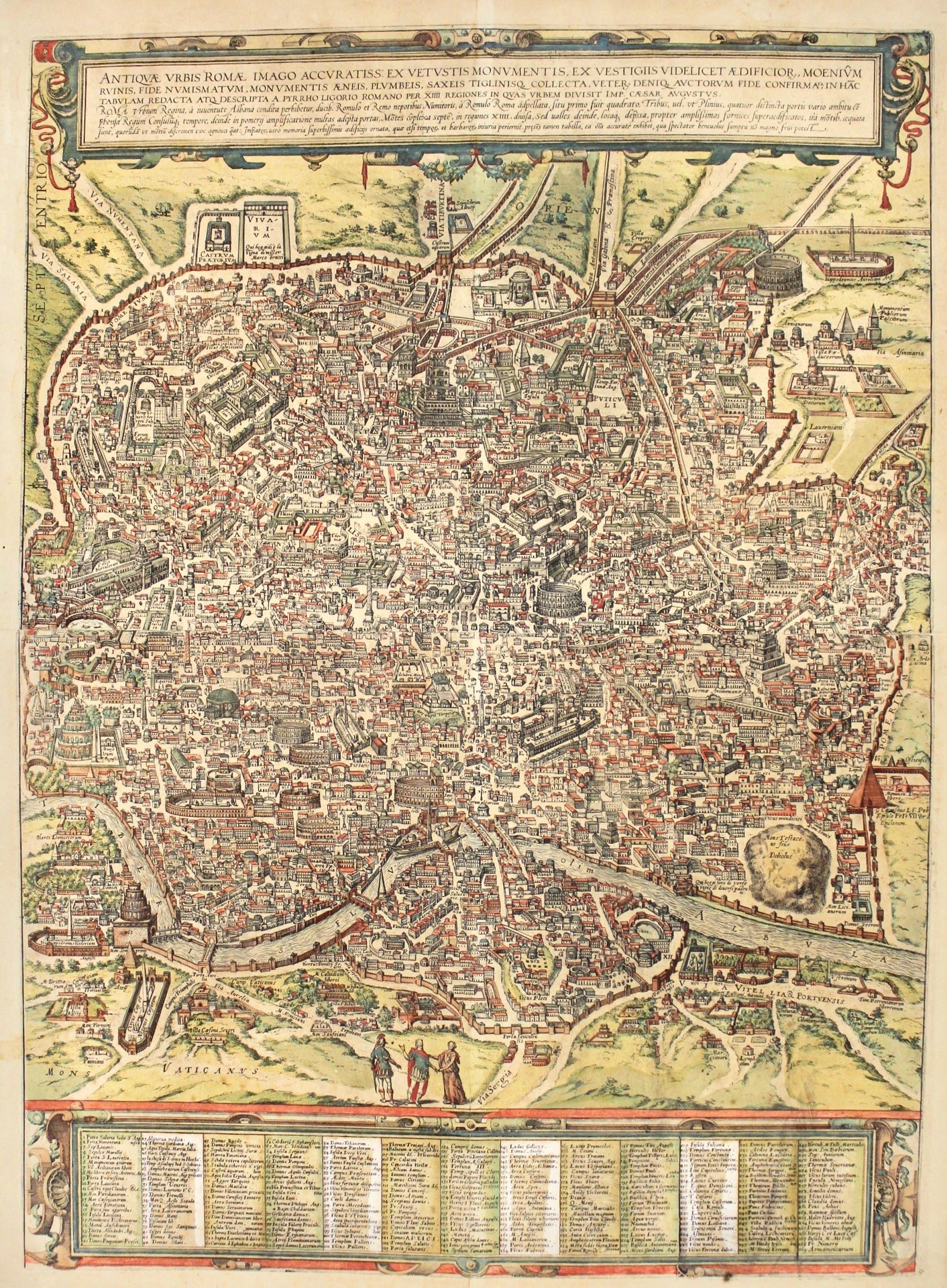 Incisione in rame eseguita su due fogli uniti, mm 683x500 in fascinosa coloritura coeva. Questa pianta, ricostruzione della Roma augustea, è ricavata dal modello di Pirro Ligorio, presenta in basso una legenda con 269 rimandi e rappresenta un progetto molto ambizioso da parte del Ligorio. Tratta da “Civitates Orbis Terrarum”, pietra miliare del vedutismo, stampata dal 1572 al 1617 in 6 volumi pubblicati in anni differenti in varie lingue, compilata e scritta da Georg Braun, mentre Frans Hogenberg fu autore delle incisioni insieme a Simon Novellanus, generalmente da soggetti di Hoefnagel. Si tratta di una delle pochissime vedute e piante in foglio doppio dell’opera. Ottimo esemplare con margini originali di circa cm 2,5. Fauser A., 11932, Caldana, Roma antica, pag. 84.