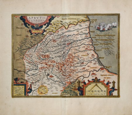 Questa mappa dell'Abbruzzo Ulteriore, che compare per la prima volta nell'Additamentum del 1590 del Thatrum Orbis Terrarum di Ortelius, si basa sostanzialmente sulla carta di Natale Bonifacio, stampata su un solo foglio, edita a Roma nel 1587 (Meurer p. 118), Esemplare tratto dall'edizione italiana del 1612 del Theatrum Orbis Terrarum, che è considerato il primo vero “atlante” moderno. L’opera fu pubblicata in 7 lingue e 36 edizioni, per il quale – nel 1570 - Ortelius ottenne il ' privilegio, ovvero una sorta di diritto d'autore che impediva ad altri cartografi di pubblicare i propri lavori. Il ' Theatrum ' rappresentava il lavoro più avanzato del lavoro della descrizione cartografica. L’Ortelius vi raccolse il sapere geografico e cartografico del suo tempo, proponendo in 147 spettacolari tavole incise l’immagine più fedele del mondo allora conosciuto e, in alcune straordinarie “carte storiche”, regioni e itinerari tratti dalla letteratura, dalla mitologia, dalla tradizione. Ortelius fu anche il primo a citare le fonti, menzionando i nomi dei cartografi nel “catalogus auctorum”. Dal 1598 al 1612 le edizioni postume del ' Theatrum ' furono realizzate dal suo collaboratore Johannes Baptiste Vrients. Incisione su rame, magnifica coloritura coeva, in ottimo stato di conservazione. ' This map of Ulterior Abruzzi, occures for the first time in 1590 Additamentum of Theatrum Orbis Terrarum by Ortelius. It's based on the work by Natale Bonifacio (1538-1592) , on a single sheet, published in Rome in 1587 (Meurer p. 118).This example was part of 1608 Italian edition of Theatrum Orbis Terrarum, which is considered the first true modern "Atlas". The work was published in 7 languages and 36 editions, for which - in 1570 - Ortelius obtained the privilege, a kind of copyright that prevented other cartographers from publishing his works. The ' Theatrum ' represented the most advanced work of cartographic description. Ortelius collected in it the geographical and cartographic knowledge of his time, proposing in 147 spectacular engraved plates the most faithful image of the world then known and, in some extraordinary "historical maps", regions and routes taken from literature, mythology, tradition. Ortelius was also the first to cite sources, mentioning the names of cartographers in the "catalogus auctorum". From 1598 to 1612 the posthumous editions of the ' Theatrum ' were made by his collaborator Johannes Baptiste Vrients. Copper engraving, fine contemporary coloring, in good condition. Cfr. Van den Broecke Ort 138; Koeman/Meurer:117, Karrow: 1/170, vdKrogtAN: 7430:31.