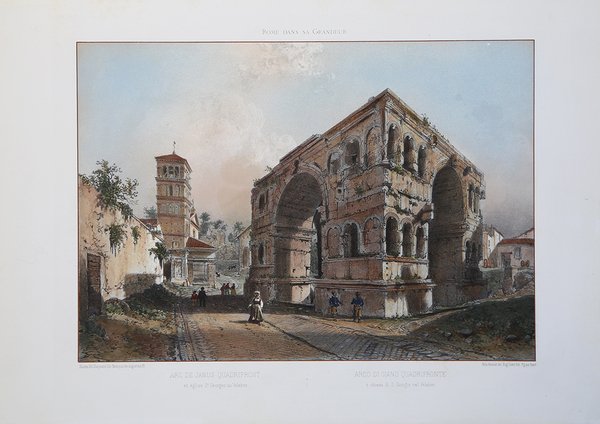 Veduta tratta dalla monumentale opera di Felix Benoist Rome dans sa grandeur. Vues, monument ancient et modernes stampata a Parigi in 3 volumi, da Henri Charpentier, nel 1870. La pubblicazione, illustrata da 100 litografie, fu preceduta da una campagna di disegni preparatori, a far data dal 1864 sino al 1869, eseguita soprattutto da Félix Benoist e in parte da Philippe Benoist. Alla vigilia del Concilio Ecumenico Vaticano I, l’11 agosto 1869, Pio IX decretava la realizzazione di una Esposizione romana delle opere d’ogni arte eseguite per il culto cattolico, che venne inaugurata, il 17 febbraio 1870, nel chiostro della Certosa di Santa Maria degli Angeli. In quell’occasione, vennero presentati i tre volumi in folio Rome dans sa grandeur. I volumi, rilegati in modo sfarzoso, con impresso al centro in oro, lo stemma di Pio IX, sono suddivisi in tre sezioni. Il primo volume tratta di Roma antica, il secondo, di Roma cristiana, ed il terzo, dei monumenti e le realizzazioni della Roma moderna. Una visione preziosa della Roma papale alla vigilia della profonda trasformazione di Roma in capitale dell’Italia unita. Un documento che evidenzia la notevole impronta lasciata da Pio IX nella Città Eterna. L’opera rappresenta il capolavoro dell’artista francese, dove ogni veduta è realizzata in litografia tinta, processo ottenuto usando un diverso numero di pietre. Il risultato è un’opera di grande effetto, tanto da porre il Benoist tra la schiera dei più grandi artisti di interni e vedute del suo tempo. Litografia tinta, finemente colorata a mano, in ottimo stato di conservazione. View taken from the monumental work of Felix Benoist Rome dans sa grandeur. Vues, monument ancient et modernes printed in Paris in 3 volumes, by Henri Charpentier, in 1870. The publication, illustrated by 100 lithographs, was preceded by a campaign of preparatory drawings, from 1864 to 1869, executed mainly by Felix Benoist and partly by Philippe Benoist. On the eve of the First Vatican Ecumenical Council, August 11, 1869, Pius IX decreed the creation of the Esposizione romana delle opere d’ogni arte eseguite per il culto cattolico (a Roman Exhibition of the works of art created for Catholic worship), which was inaugurated on February 17, 1870, in the cloister of the Charterhouse of Santa Maria degli Angeli. On that occasion, the three volumes in folio Rome dans sa grandeur were presented. The volumes, magnificently bound, with the coat of arms of Pius IX stamped in gold in the center, are divided into three sections. The first volume deals with ancient Rome, the second with “Christian” Rome, and the third with the monuments and achievements of modern Rome. A precious vision of papal Rome on the eve of the profound transformation of Rome into the capital of united Italy. A document that highlights the remarkable imprint left by Pius IX in the Eternal City. The work represents the masterpiece of the French artist, where each view is made in tinted lithography, a process achieved by using a different number of stones. The result is a work of great effect, so much so as to place Benoist among the ranks of the greatest artists of interiors and views of his time. Tinted lithograph, finely hand-colored, in excellent condition. Cfr.
