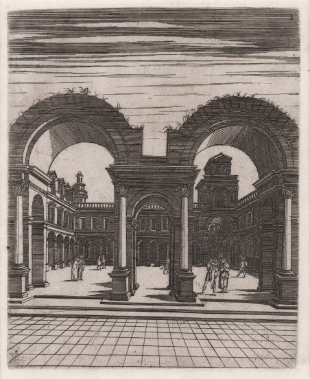Bulino, 1550 circa. Della serie: Prospettive et Antichità di Roma. ' Dedicata al cardinale Guido Ascanio Sforza, la serie è il risultato di una raccolta di disegni fatta dall'autore. Il numero di tavole che compone l'opera varia, a seconda dei diversi esemplari, da un minimo di venti ad un massimo di quarantasette. Le prime venti tavole, che seguono il frontespizio non datato e la dedica, rappresentano architetture immaginarie composte da archi, portici classicheggianti, spesso con pavimentazione quadrettata. In alcuni casi, le scene sono arricchite da piccoli personaggi. Queste vedute fantastiche non sono creazioni originali di Michele Lucchese, ma si basano sulla serie Vue d'optique, pubblicata nel 1551 ad Orléan dall'architetto e incisore Androuet du Cerceau. Rispetto al modello francese, Lucchese apporta una serie di rilevanti modifiche, a cominciare dal formato che, da circolare, diventa rettangolare. Circa la datazione della serie del Lucchese, un sicuro terminus post quem è il 1551, anno della pubblicazione di Vue d'Optique. M. Bury data, invece, la serie al 1563-64. Probabilmente le prime 20 tavole furono realizzate tra il 1554 e il 1557, poiché, nella dedica al cardinale, l’autore Sforza fa riferimento a la superba “fabrica…ch'ella fa hora”: si tratterebbe del palazzo Sforza di Proceno, unico edificio che il cardinale abbia fatto costruire e i cui lavori furono avviati nel 1554; nel 1557, invece, una parte dell'edificio risultava abitabile. Le altre tavole, di invenzione del Grechi, con varie vedute romane, sembrerebbero più tarde e riferibili agli anni 1578-80; pertanto, è ipotizzabile che queste tavole siano state aggiunte solo in un secondo momento alla serie originaria. Engraving, 1550 circa. Unlettered, printed on contemporary laid paper, in very good condition. From the series: Prospettive et Antichità di Roma by Michele Greco. ' Dedicated to Cardinal Guido Ascanio Sforza, the series is the result of a collection of drawings made by the author. The number of plates is different for each specimen, by a minimum of twenty to a maximum of forty-seven. The first twenty tables, that follow the title page undated and dedication, consist of perspective views of generalized buildings, somewhat ruined; composed of arches and classical porticos, often with squared flooring. In some cases, the scenes are populated by small figures. These fantastic views are original creations by Michele Lucchese but they are based on the series Vue d'optique, published in 1551 at Orléan, by the architect and engraver Androuet du Cerceau. Compared to the French model, Lucchese makes a number of major changes, starting from the format: Du Cercau’s images were all printed with circular fields on rectangular sheets of paper; Lucchese in his copy expanded the composition to a rectangle. About the dating of the Lucchese's series, a secure terminus post quem is 1551, the year of publication of the Vues d'Optique. M. Bury, however, dates the series to 1563-64. Probably, the first 20 plates were executed between 1554 and 1557, since in the dedication to Cardinal Sforza the author refers to la superba “fabrica…ch'ella fa hora”. This building would be the Sforza palace of Proceno, the only building that the cardinal has built and whose works started in 1554, while in 1557 a part of the building resulted livable. The other plates, original inventions by Lucchese, with various Roman views, seem to be executed later and related to the years 1578-80; therefore, it is possible that these plates have been added only in a second time to the original series. Cfr. P. Picardi, Perino del Vaga Michele Lucchese e il Palazzo di Paolo III al Campidoglio, pp. 89-101.