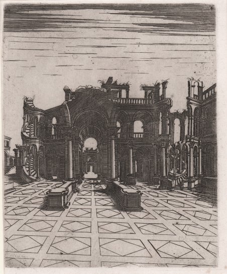 Bulino, 1550 circa. Della serie: Prospettive et Antichità di Roma. ' Dedicata al cardinale Guido Ascanio Sforza, la serie è il risultato di una raccolta di disegni fatta dall'autore. Il numero di tavole che compone l'opera varia, a seconda dei diversi esemplari, da un minimo di venti ad un massimo di quarantasette. Le prime venti tavole, che seguono il frontespizio non datato e la dedica, rappresentano architetture immaginarie composte da archi, portici classicheggianti, spesso con pavimentazione quadrettata. In alcuni casi, le scene sono arricchite da piccoli personaggi. Queste vedute fantastiche non sono creazioni originali di Michele Lucchese, ma si basano sulla serie Vue d'optique, pubblicata nel 1551 ad Orléan dall'architetto e incisore Androuet du Cerceau. Rispetto al modello francese, Lucchese apporta una serie di rilevanti modifiche, a cominciare dal formato che, da circolare, diventa rettangolare. Circa la datazione della serie del Lucchese, un sicuro terminus post quem è il 1551, anno della pubblicazione di Vue d'Optique. M. Bury data, invece, la serie al 1563-64. Probabilmente le prime 20 tavole furono realizzate tra il 1554 e il 1557, poiché, nella dedica al cardinale, l’autore Sforza fa riferimento a la superba “fabrica…ch'ella fa hora”: si tratterebbe del palazzo Sforza di Proceno, unico edificio che il cardinale abbia fatto costruire e i cui lavori furono avviati nel 1554; nel 1557, invece, una parte dell'edificio risultava abitabile. Le altre tavole, di invenzione del Grechi, con varie vedute romane, sembrerebbero più tarde e riferibili agli anni 1578-80; pertanto, è ipotizzabile che queste tavole siano state aggiunte solo in un secondo momento alla serie originaria. Engraving, 1550 circa. Unlettered, printed on contemporary laid paper, in very good condition. From the series: Prospettive et Antichità di Roma by Michele Greco. ' Dedicated to Cardinal Guido Ascanio Sforza, the series is the result of a collection of drawings made by the author. The number of plates is different for each specimen, by a minimum of twenty to a maximum of forty-seven. The first twenty tables, that follow the title page undated and dedication, consist of perspective views of generalized buildings, somewhat ruined; composed of arches and classical porticos, often with squared flooring. In some cases, the scenes are populated by small figures. These fantastic views are original creations by Michele Lucchese but they are based on the series Vue d'optique, published in 1551 at Orléan, by the architect and engraver Androuet du Cerceau. Compared to the French model, Lucchese makes a number of major changes, starting from the format: Du Cercau’s images were all printed with circular fields on rectangular sheets of paper; Lucchese in his copy expanded the composition to a rectangle. About the dating of the Lucchese's series, a secure terminus post quem is 1551, the year of publication of the Vues d'Optique. M. Bury, however, dates the series to 1563-64. Probably, the first 20 plates were executed between 1554 and 1557, since in the dedication to Cardinal Sforza the author refers to la superba “fabrica…ch'ella fa hora”. This building would be the Sforza palace of Proceno, the only building that the cardinal has built and whose works started in 1554, while in 1557 a part of the building resulted livable. The other plates, original inventions by Lucchese, with various Roman views, seem to be executed later and related to the years 1578-80; therefore, it is possible that these plates have been added only in a second time to the original series. Cfr. P. Picardi, Perino del Vaga Michele Lucchese e il Palazzo di Paolo III al Campidoglio, pp. 89-101