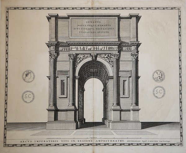Bella veduta dell'arco di Tito. Opera per la prima volta pubblicata nel Theatrum Civitatum et admirandorum Italiae, pubblicato ad Amsterdam nel 1663. Johannes Blaeu, durante la sua lunga attività editoriale pubblica tre volumi sulle città italiane. ' Nel 1663 i primi tre comprendevano: Stato della Chiesa, Roma e Regno di Napoli, Sicilia. ' Alla sua morte, i suoi eredi danno alla luce altri due volumi, datati 1682, incentrati sulle città del Piemonte e della Savoia, poi ristampati da altri editori nel 1693 e 1697. Il francese Pierre Mortier pubblica una ristampa nel 1704/5, intitolata Nouveau Theatre de l’Italie. ' L’opera, in quattro volumi, comprende le lastre del Blaeu, ritoccate e modificate in piccola parte, integrate dall’aggiunta di numerose nuove mappe di proprio disegno, raffiguranti le città della parte settentrionale della penisola, racchiuse nel primo volume dell’opera. ' L’atlante del Mortier venne pubblicato con testo latino, francese ed olandese. La particolarità che differenzia le due edizioni di Blaeu e Mortier è rappresentata dal fatto che il testo non è al verso della singola mappa (che quindi è bianca nel retro), ma si trova all’inizio di ogni singolo volume. ' Il grande successo dell’opera diede origine ad un’ulteriore ristampa, praticamente identica, curata da R. Alberts ed edita nel 1724/5. Le opere tratte dalla prima edizione del Blaeu, 1663, sono caratterizzate dalla presenza del testo al verso e sono piuttosto rare. ' Incisione in rame, in buono stato di conservazione. ' Esemplare tratto dal Nouveau Theatre de l'Italie pubblicato ad Amsterdam nel 1704/5 o nel 1724. Bella veduta dell'arco di Tito. Opera per la prima volta pubblicata nel ' Theatrum Civitatum et admirandorum Italiae, pubblicato ad Amsterdam nel 1663. Johannes Blaeu, durante la sua lunga attività editoriale pubblica tre volumi sulle città italiane. ' Nel 1663 i primi tre comprendevano: Stato della Chiesa, Roma e Regno di Napoli, Sicilia. ' Alla sua morte, i suoi eredi danno alla luce altri due volumi, datati 1682, incentrati sulle città del Piemonte e della Savoia, poi ristampati da altri editori nel 1693 e 1697. Il francese Pierre Mortier pubblica una ristampa nel 1704/5, intitolata ' Nouveau Theatre de l’Italie. ' L’opera, in quattro volumi, comprende le lastre del Blaeu, ritoccate e modificate in piccola parte, integrate dall’aggiunta di numerose nuove mappe di proprio disegno, raffiguranti le città della parte settentrionale della penisola, racchiuse nel primo volume dell’opera. ' L’atlante del Mortier venne pubblicato con testo latino, francese ed olandese. La particolarità che differenzia le due edizioni di Blaeu e Mortier è rappresentata dal fatto che il testo non è al verso della singola mappa (che quindi è bianca nel retro), ma si trova all’inizio di ogni singolo volume. ' Il grande successo dell’opera diede origine ad un’ulteriore ristampa, praticamente identica, curata da R. Alberts ed edita nel 1724/5. Le opere tratte dalla prima edizione del Blaeu, 1663, sono caratterizzate dalla presenza del testo al verso e sono piuttosto rare. ' Incisione in rame, in buono stato di conservazione. ' Esemplare tratto dal ' Nouveau Theatre de l'Italie ' pubblicato ad Amsterdam nel 1704/5 o nel 1724. Cfr. Koeman pp. 332/338, Cremonini pp. 83-90.