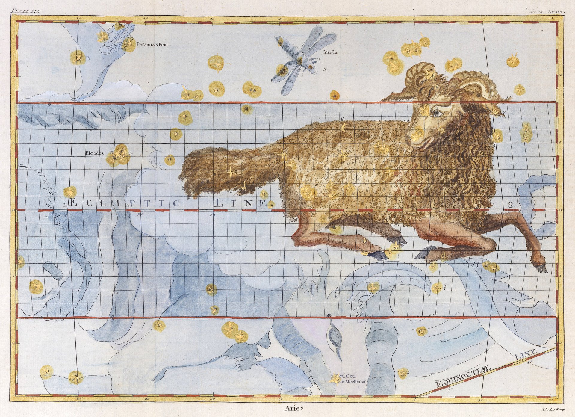 Incisione in rame. Mm 210x305. Finemente dipinta a mano. In alto a sinistra riporta, Plate XIV, in basso a destra, J. Lodge sculp. e al centro Aries.<BR>Pubblicata per la prima volta ad Augusta nel 1603, l'Uranometria di Bayer fu uno dei grandi atlanti celesti del XVII secolo. Fu il primo atlante a introdurre l'attuale nomenclatura delle stelle. Una caratteristica importante dell'atlante di Bayer fu l'introduzione di un nuovo sistema di nomenclatura stellare. Bayer assegnò lettere greche alle stelle più luminose, generalmente nell'ordine di magnitudine, in modo che la stella luminosa nell'Occhio del Toro diventasse alfa Tauri (e la stella più luminosa nel Centauro diventasse la nostra familiare alfa Centauri). Le carte di Bayer sono raramente offerte separatamente sul mercato. Il nostro esemplare è tratto da un'edizione inglese, presumibilmente di fine '600, inizio '700. Bell'esemplare. <BR>