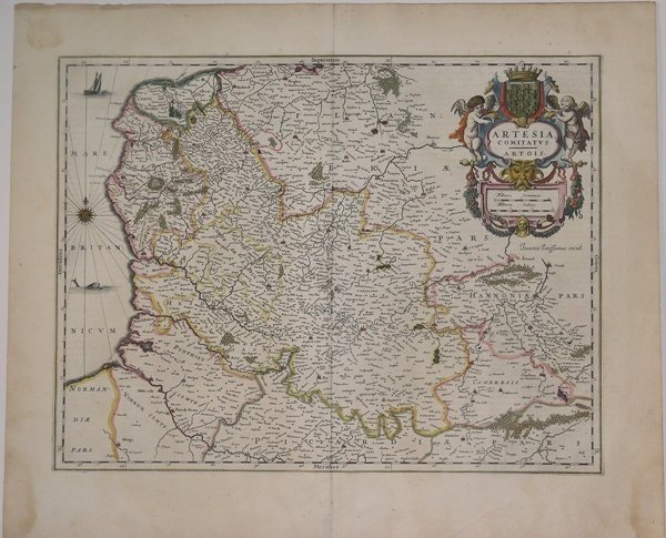 Mappa dell'Artois tratta dall'edizione degli eredi Janssonius dell'Atlas Novus. Joannes Janssonius (Arnhem, 1588-1664), son of the Arnhem publisher Jan Janssen, married Elisabeth Hondius, daughter of Jodocus Hondius, in Amsterdam in 1612. After his marriage, he settled down in this town as a bookseller and publisher of cartographic material. In 1618 he established himself in Amsterdam next door to Blaeu’s book shop. He entered into serious competition with Willem Jansz. Blaeu. His activities not only concerned the publication of atlases and books, but also of single maps and an extensive book trade with branches in Frankfurt, Danzig, Stockholm, Copenhagen, Berlin, Koningsbergen, Geneva, and Lyon. In 1631 he began publishing atlases together with Henricus Hondius. In the early 1640s Henricus Hondius left the atlas publishing business completely to Janssonius. Competition with Joan Blaeu, Willem’s son and successor, in atlas production prompted Janssonius to enlarge his Atlas Novus finally into a work of six volumes, into which a sea atlas and an atlas of the Old World were inserted. After the death of Joannes Janssonius, the shop and publishing firm were continued by the heirs under the direction of Johannes van Waesbergen (c. 1616-1681), son-in-law of Joannes Janssonius. The copperplates from Janssonius’s atlases were afterwards sold to Schenk and Valck. Incisione in rame, coloritura coeva, in ottime condizioni. Molto decorativa. KOEMAN: Me 184 & 185. Fine map depicts the northern province of Artois on the border with Belgium. Fully engraved, it illustrates forests, rivers, bridges, cities and villages. A fishing boat, sea monster and compass rose grace the sea and an elaborate title cartouche with the coat of arms completes the map. Joannes Janssonius, figlio dell'editore di Arnhem Jan Janssen, sposò Elisabeth Hondius, figlia di Jodocus Hondius, ad Amsterdam nel 1612. Dopo il suo matrimonio, si stabilì in questa città come libraio ed editore di materiale cartografico. Nel 1618 si stabilì ad Amsterdam accanto alla libreria di Willem Jansz. Blaeu, entrando in una seria competizione. Le sue attività non riguardavano solo la pubblicazione di atlanti e libri, ma anche di mappe singole e un vasto commercio di libri con filiali a Francoforte, Danzica, Stoccolma, Copenaghen, Berlino, Koningsbergen, Ginevra e Lione. Nel 1631 iniziò a pubblicare atlanti insieme a Henricus Hondius. Nei primi anni 1640 Henricus Hondius lasciò l'attività di pubblicazione di atlanti completamente a Janssonius. La concorrenza con Joan Blaeu, figlio e successore di Willem, nella produzione di atlanti spinse Janssonius ad ampliare il suo Atlas Novus finalmente in un'opera di sei volumi, in cui furono inseriti un atlante marino e un atlante del Vecchio Mondo. Dopo la morte di Joannes Janssonius, il negozio e la casa editrice furono continuati dagli eredi sotto la direzione di Johannes van Waesbergen (c. 1616-1681), genero di Joannes Janssonius. Le matrici degli atlanti di Janssonius furono in seguito vendute a Schenk e Valck. Fine original color, very good. Cfr.