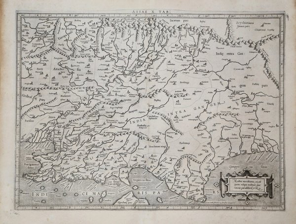 Questa carta presenta la visione tolemaica dell'India. La catena dell'Himalaya si estende sulla parte superiore della carta e i sistemi fluviali dell'Indo e del Gange sono ben delineati. Tuttavia, il subcontinente è notevolmente accorciato e manca di quasi tutta la parte meridionale dell'India. La punta settentrionale di Taprobana (Sri Lanka) appare in basso. Mappa tratta dal ' Cl. Ptolemaei Alexandrini, Geographiae Libri Octo, ' pubblicata prima a Colonia da Gottfried von Kempen (1578) e poi ristampata dallo stesso editore nel 1584 (Van der Krogt 1, 502) e poi da Isaac Elsevier per il ' Theatrum Geographiae veteris ' di Petrus Bertius (Leyden 1618). Di tutte le edizioni di Tolomeo, quella di Gerard Kremer (Mercatore), pubblicata nel 1578, e forse tecnicamente la più bella. A questo punto la ' Geografia ' di Tolomeo perdeva però ogni pretesa di “attualità”, laddove lo scopo di Mercatore era quello di produrre un atlante del mondo classico che servisse da complemento al suo atlante moderno (per tale ragione egli aveva tentato di recuperare la forma originale dell’atlante tolemaico, scartandone le moderne accrezioni). L'interpretazione di Mercatore del testo tolemaico, per le 28 carte che illustrano la sua ' Geographia ' è stata, quindi, una delle più veritiere. Egli aveva passato 13 anni a ricercare, disegnare e incidere le carte, rinunciando anche alla pubblicazione delle sue carte “moderne”. Questo esemplare proviene dal ' Theatrum Geographia Veteris ' di Petrus Bertius edita a Leida nel 1618, che combina il Tolomeo di Mercator, le 8 tavole del Moretus per rappresentare la ' Tabula Peutingeriana ' e 14 mappe storiche delle regioni d'Europa derivate dal ' Parergon ' di Ortelius. Acquaforte, finemente colorata a mano, in ottime condizioni. ' This map presents the Ptolemaic view of India. The Himalayan Mountains stretch across the top of the map and the Indus and Ganges river systems are well delineated. However, the subcontinent is considerably shortened and lacks nearly the entire southern part of India. The northern tip of Taprobana (Sri Lanka) appears at bottom. Map taken from the ' Cl. Ptolemaei Alexandrini, Geographiae Libri Octo, ' first published in Cologne by Gottfried von Kempen (1578) and then reprinted by the same publisher in 1584 (Van der Krogt 1, 502) and then by Isaac Elsevier for the Petrus Bertius’ ' Theatrum Geographiae veteris ' (Leyden 1618). Mercator's interpretation of the 28 Ptolemaic text was possibly one of the truest undertaken up until that time. He had spent 13 years researching, drawing and engraving the maps at much commercial sacrifice to himself, having seen Ortelius's ' Theatrum ' and De Jodes ' Speculum ' published, to become both technical and commercial successes. In later life he devoted himself to his edition of the maps in Ptolemy's ' Geographia, reproduced in his own engraving as nearly as possible in their original form. This example comes from the ' Theatrum Geographia Veteris ' of Petrus Bertius published in Leiden in 1618, which combines Mercator's Ptolemy, the 8 plates of Moretus to represent the ' Tabula Peutingeriana ' and 14 historical maps of the regions of Europe derived from the ' Parergon ' of Ortelius. Copperplate with fine later hand colour, in good condition. Cfr.