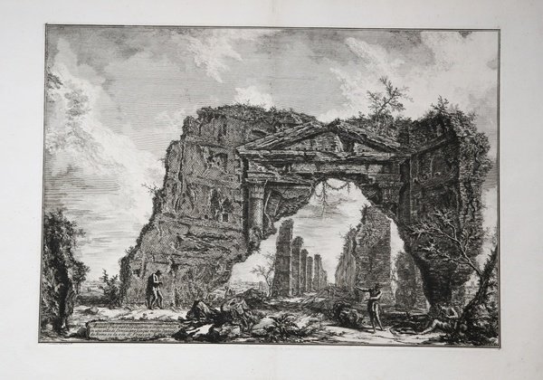 - PRIMO STATO DI TRE -Acquaforte e bulino, 1766, firmata in lastra. Esemplare della contemporanea tiratura romana. Magnifica prova, impressa su carta vergata coeva con filigrana “doppio cerchio e giglio con lettere CB”, con pieni margini, in perfetto stato di conservazione. Della serie Vedute di Roma. L’opera consiste in 135 lastre prodotte individualmente dal Piranesi per almeno 30 anni, da circa il 1745, fino alla data della sua morte. All’opera sono aggiunte poi due vedute realizzate dal figlio Francesco. Per la prima volta furono edite dall’editore Giovanni Bouchard nel 1751 (34 lastre), successivamente dallo stesso Piranesi editore a Strada Felice prima e Palazzo Tomati poi (indirizzi che appaiono su molte tavole), fino alla stesura definitiva composta da 137 lastre. Successivamente alla morte dell’autore le matrici furono ereditate dal figlio Francesco, che ne curò la pubblicazione prima nella capitale - le cosiddette tirature “postume romane” - e successivamente a Parigi, dove furono stampate tre edizioni – la cosiddetta “prima di Parigi”, una intermedia (entrambe su carta vergata) e quella curata dall’editore Firmin Didot, la prima su carta senza vergelle, dove le tavole presentano l’aggiunta di un numero arabo ordinale. Tutte le tirature parigine sono piuttosto modeste in qualità, lontane da come il Piranesi le aveva pensate e concepite. Le lastre furono poi acquisite dalla Calcografia Camerale, poi Calcografia Nazionale, oggi Istituto Centrale per la Grafica, dove sono tuttora conservate. - THE FIRST STATE OF THREE -Etching with engraving, 1766, signed on plate. From the contemporary Roman Edition. A very good impression, printed on contemporary laid paper with watermark "double encircled fleur de lys with letters CB", with margins, very good condition. Taken from Vedute di Roma. The whole work consists of 135 plates which have been individually produced by Piranesi along 30 years, from 1745 circa until his death. Two more works have been subsequently added, two plates by his son Francesco. They have been printed for the first time in 1751 (34 plates) by the editor Giovanni Bouchard, afterwards by Piranesi himself, publisher first in Strada Felice an the in Palazzo Tomati, imprint that can be found in mostly of the plates), until the final edition of 137 plates. After Piranesi's death, his son Francesco inherited the plates, editing them first in Rome and then in Paris, where three editions were printed - the so-called "first Paris edition", an intermediate one (both on laid paper) and the one edited by the publisher Firmin Didot, the first on wowe paper, where the plates have an Arabic ordinal number added. All Parisi issues are rather modest in quality, far from how Piranesi had thought and conceived them. The plates were then acquired by the Calcografia Camerale, then Calcografia Nazionale, today Istituto Centrale per la Grafica, where they are still kept. Cfr. Hind 79, I/III; Focillon 781; Wilton Ely 212.