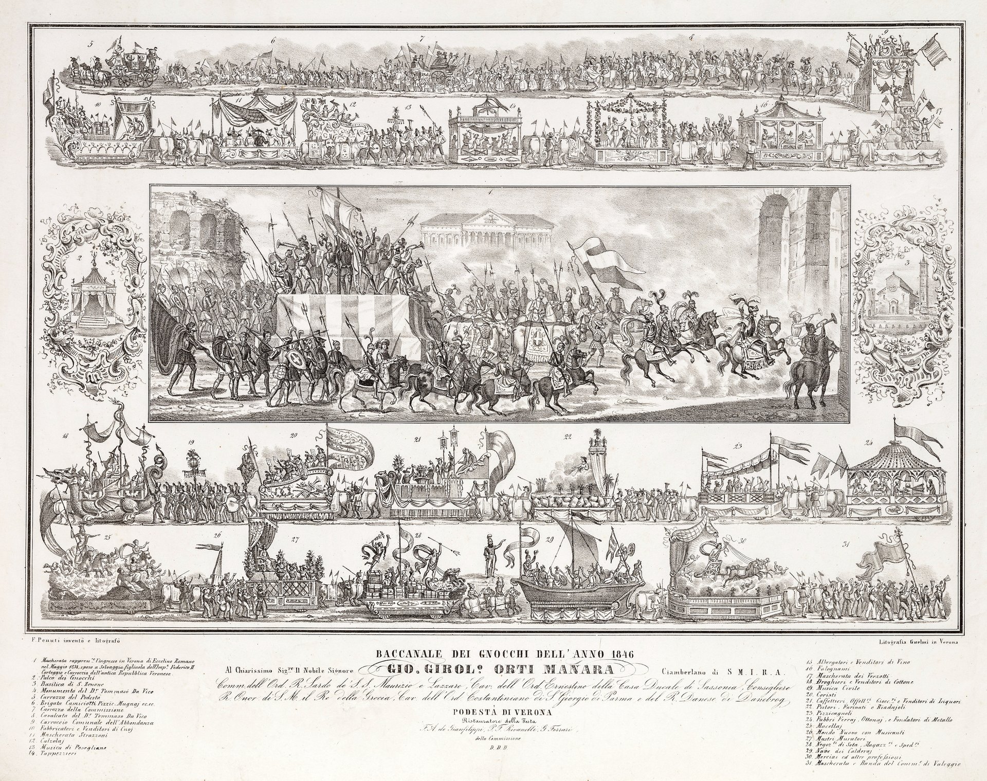 Litografia, firmata "F. Penuti inventò e litografò" in basso a sinistra e "Litografia Guelmi in Verona" a destra; mm 368x560 immagine), mm 450x368 (compreso il testo di dedica e la legenda), colorata. Ben conservato e marginoso esemplare.<BR>Rara stampa di carattere popolare dedicata al carnevale veronese, dedicata al conte Orti Manara, podestà di Verona ristauratore della festa.In basso ai lati è inserita una legenda 1-31 esplicativa dei carri delle varie corporazioni e del corteo in generale. Al centro il carroccio dei veronesi ed una mascherata. <BR>La serie di stampe dedicate al Carnevale, fu ampliata annualmente a partire dal 1838 fino al 1847 con un nuovo soggetto. Poi si interruppe la tradizione, ripristinata per soli due anni (1858-1859) con la dedica a Ottavio di Canossa. (Girardi-Perini, pag. 93: A partire dal 1812 la festa del Venerdì Gnoccolare conosce un lento declino fino a quando nel 1838, viene nominato podestà di Verona Giovanni Girolamo Orti Manara, che ripristina il Carnevale, guadagnandosi per questo motivo l'appellativo di "Gnocco". Il corteo tradizionale subisce varie modifiche, trasformandosi in un corso di carri allegorici, allestiti dalle associazioni di mestiere, e di carri a commemorare episodi della storia di Verona, soprattutto medievale, forse su sollecitazione dello stesso Orti Manara, che aveva un vivo interesse per la storia). <BR>BIBLIOGRAFIA: Girardi-Perini, Antiche stampe di Verona dal Quattrocento al Novecento, pag. 94 (cita altre stampe della stessa serie); Sinistri-Perini, Verona nelle antiche stampe, scheda 346. <BR><BR>
