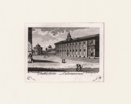 Veduta tratta dalla celebre Raccolta di num. 320 Vedute sì antiche, che moderne della città di Roma. …Incise a bulino in N. 80 rami, In Roma Nella Calcografia di Agapito Franzetti a Torsanguigna Col Permesso. ' L’opera si compone di un frontespizio calcografico e di 80 tavole numerate, ognuna composta da quattro vedute. Viene stampata senza data; molti repertori la datano intorno al 1790 circa, forse perché stampata su carta vergata. Una datazione intorno al 1800 ci sembra tuttavia più plausibile. ' Agapito Franzetti, calcografo attivo a Roma con bottega tra via del Corso e Torsanguigna, è noto per le sue piccole incisioni di veduta che servivano spesso come biglietti da visita. Tutte contengono, infatti, una linea in basso, dove si poteva apporre il proprio nome ad inchiostro. Come indicato nel titolo, le vedute raffigurano sia monumenti e antiche rovine che vedute “moderne”, con piazze, chiese e ville. Ciascuna tavola reca, in basso al centro, il nome dell’incisore. Gli artisti coinvolti sono sei: Jean-Jerome Baugean; Antonio Giuseppe Barbazza; Giovanni Battista Cipriani; Francesco Morelli; Antonio Poretta e Domenico Pronti. Molte delle vedute derivano dalla celebre opera di Giuseppe Vasi, Delle magnificenze di Roma antica e moderna. Pubblicata in 10 volumi dal 1747 al 1761, l’opera presenta 238 incisioni in rame, ciascuna incisione con testo narrativo che fornisce informazioni storiche e documentarie. ' Acquaforte, in buono stato di conservazione. ' Bibliografia: A. Bertarelli, H. Prior, Il biglietto da visita italiano. Contributo alla storia del costume e dell'incisione nel secolo XVII, Bergamo 1911, p. 162. View of the city printed in Rome by the publisher Agapito Franzetti. Taken from Raccolta di num. 320 Vedute sì antiche, che moderne della città di Roma. …Incise a bulino in N. 80 rami, In Roma Nella Calcografia di Agapito Franzetti a Torsanguigna Col Permesso. ' The work consists of an intaglio frontispiece and 80 numbered plates, each consisting of four views. It is printed without date; many repertories date it around 1790, perhaps because it was printed on laid paper. A date around 1800 seems more plausible. Franzetti, a chalcographer working in Rome with a workshop between Via del Corso and Torsanguigna, is known for his small engravings of views that were often used as business cards. They all contain a line at the bottom where one's name could be written in ink. The small views were often printed four to a sheet. As indicated in the title, the views depict both monuments and ancient ruins and "modern" views, with squares, churches and villas. Each table bears, at the bottom center, the name of the engraver. There are six artists involved: Jean-Jerome Baugean; Antonio Giuseppe Barbazza; Giovanni Battista Cipriani; Francesco Morelli; Antonio Poretta and Domenico Pronti. ' The views are made after Giuseppe Vasi’s monumental work Delle magnificenze di Roma antica e moderna. Published in 10 volumes from 1747 to 1761, the work features 238 copper engravings, each engraving with a narrative text that provides historical and documentary information. ' Bibliografia: A. Bertarelli, H. Prior, Il biglietto da visita italiano. Contributo alla storia del costume e dell'incisione nel secolo XVII, Bergamo 1911, p. 162. Cfr.