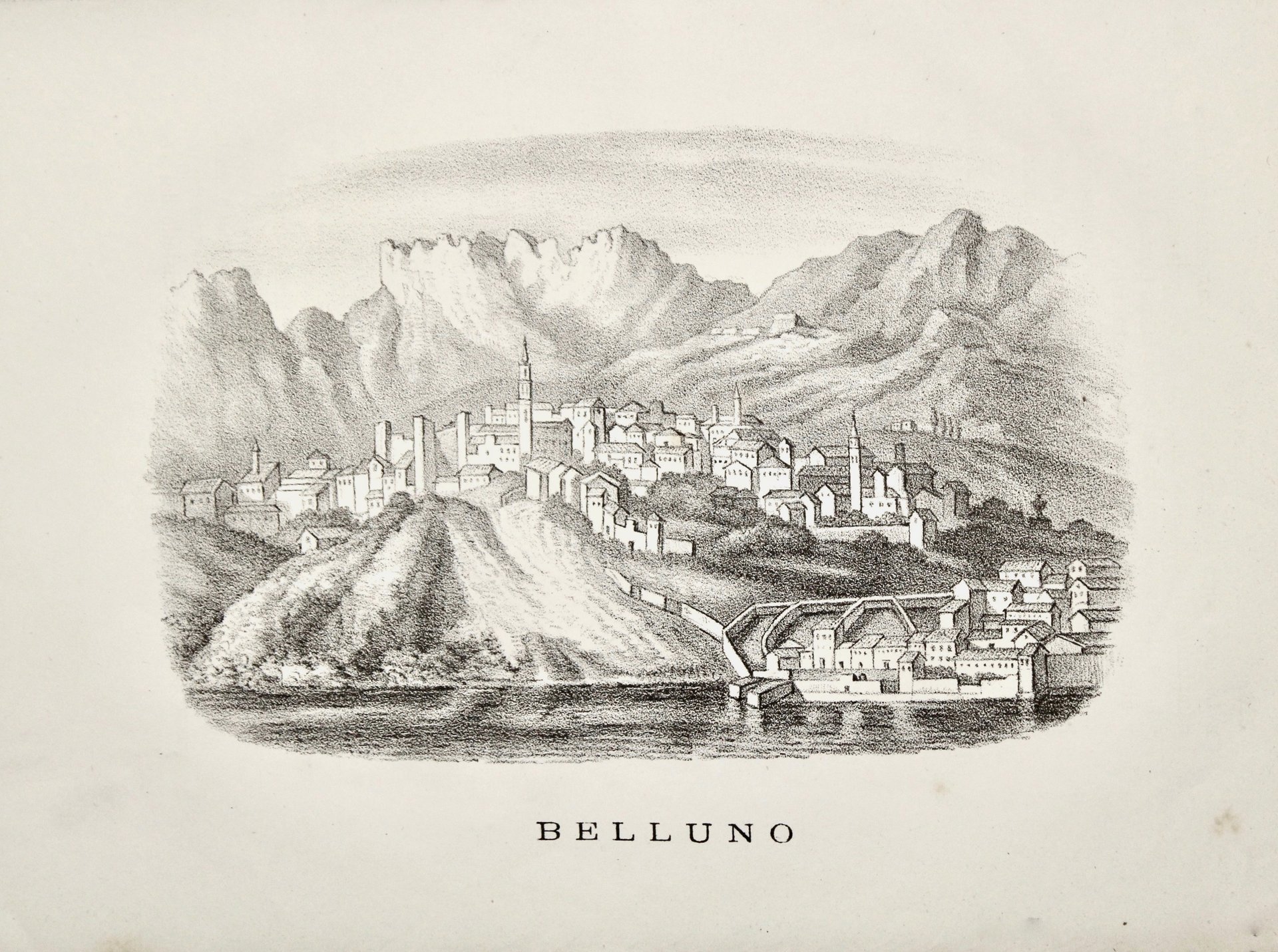 Litografia, mm 110x170. Tratta da “L’Italia pittoresca nel suo territorio, città, borghi, castelli…”. Ben conservata. De Nard, Belluno e Feltre nelle stampe antiche, n. 65