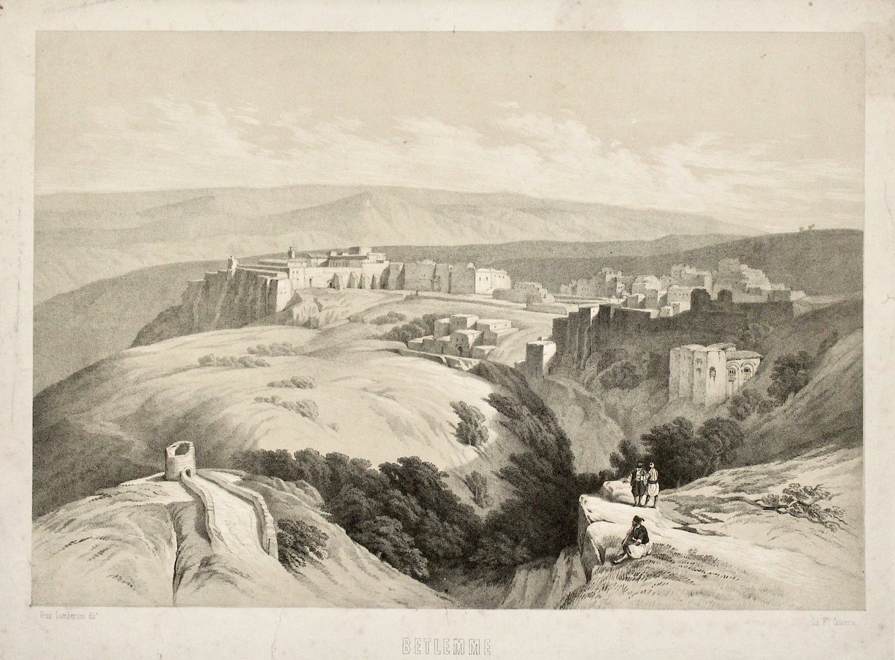 Litografia di mm 270x385 raffigurante una bella veduta di Betlemme. Discrete condizioni con minime fioriture, leggere pieghe e alcuni piccoli strappetti marginali. <BR>