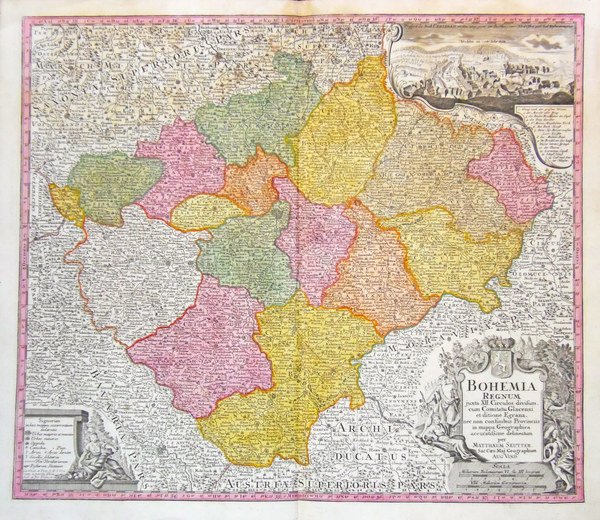 Incisione in rame, coloritura originale d'epoca con splendidi cartigli e prospetto della città di Carlsbad in bianco nero. mm 490x565. Seutter, dopo un apprendistato presso Homann a Norimberga, trasferitosi ad Augsburg verso il 1720, aprì la propria attività superando il maestro sotto il profilo della bellezza: le sue carte hanno sempre colori brillanti e cartigli elaborati. Esemplare in ottimo stato di conservazione, lieve ossidazione in alto alla piega centrale. Copperplate, original colour, mm 490x565. Very good example in fine colour. Seutter, after having worked with Homann in Nuremberg, opened his own activity in Augsburg around 1720. His maps always have elaborate cartouches and are very decorative and printed on good paper.