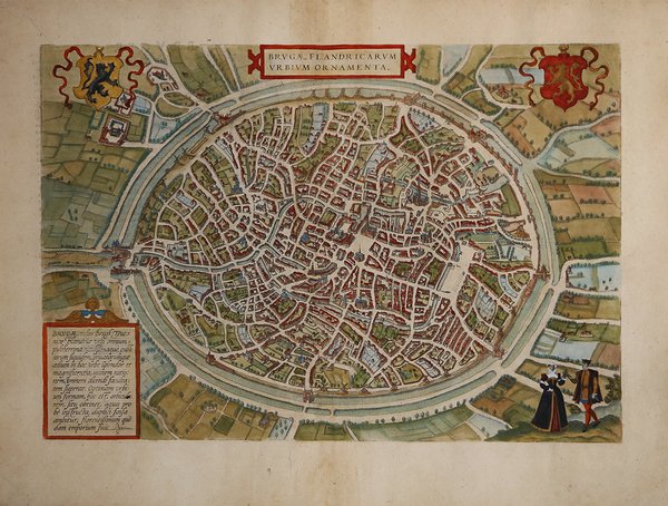 Bella veduta a volo d'uccello della città di Bruges in Belgio. ' La città, nelle Fiandre occidentali, è rappresentata in una veduta planimetrica a volo d'uccello da nord-ovest, circondata da numerosi mulini a vento. Al centro si vede la piazza del mercato con la sala dei panni, un complesso rettangolare risalente al XIII secolo e dotato di un campanile. In diagonale a destra, dietro di essa, con la sua torre ancora più alta, si trova la chiesa gotica di Onze-Lieve-Vrouwe, luogo di sepoltura di Carlo il Temerario e Maria di Borgogna. L’opera è inserita nel ' Civitates Orbis Terrarum, il primo atlante devoto esclusivamente alle piante e vedute delle principali città del mondo. Il primo volume delle ' Civitates Orbis Terrarum ' fu pubblicato a Colonia nel 1572. Il sesto e ultimo volume apparve nel 1617. Questo grande atlante di città – cartografia urbana - curato da Georg Braun e inciso in gran parte da Franz Hogenberg, conteneva 546 prospettive, vedute a volo d'uccello e vedute cartografiche di città di tutto il mondo. Franz Hogenberg realizzò le tavole dei primi quattro volumi e Simon van den Neuwel (Novellanus, attivo dal 1580) quelle dei volumi V e VI. Georg Braun (1541-1622), un ecclesiastico di Colonia, fu il principale redattore dell'opera e fu molto aiutato nel suo progetto dalla vicinanza e dal continuo interesse di Abraham Ortelius, il cui ' Theatrum Orbis Terrarum ' del 1570 fu, come raccolta sistematica e completa di mappe di stile uniforme, il primo vero atlante. Le ' Civitates, ' in effetti, erano destinate ad accompagnare il ' Theatrum, ' come indicato dalla somiglianza dei titoli e dai riferimenti contemporanei sulla natura complementare delle due opere. Tuttavia, le ' Civitates ' erano progettate per avere un approccio più popolare, senza dubbio perché la novità di una raccolta di piante e vedute di città rappresentava un'impresa commerciale più rischiosa di un atlante mondiale, per il quale c'erano stati diversi precedenti di successo. Franz Hogenberg (1535-1590) era figlio di un incisore di Monaco che si era stabilito a Malines. Incise la maggior parte delle tavole del ' Theatrum ' di Ortelius e la maggior parte di quelle delle ' Civitates, e potrebbe essere anche indicato come il responsabile dell'origine del progetto. Oltre un centinaio di artisti e cartografi diversi, il più importante dei quali fu l'artista di Anversa Georg Hoefnagel (1542-1600), fornirono i disegni per le tavole delle ' Civitates. Hoefnagel non solo contribuì alla maggior parte del materiale originale per le città spagnole e italiane, ma rielaborò e modificò anche quello di altri collaboratori. Dopo la morte di Hoefnagel, il figlio Jakob continuò il lavoro per le ' Civitates. Gli autori della raccolta si proponevano di raffigurare "non icones et typi urbium", cioè non immagini generiche e tipizzate, "sed urbes ipsae admirabili caelaturae artificio, spectantium oculis subiectae appareant": non intendeva alludere o idealizzare, ma rappresentare fedelmente sulla carta, riprodurre esattamente, e in tempo reale, ciò che l'occhio vede, come annunciato nella prefazione al primo volume delle ' Civitates Orbis Terrarum. Incisione in rame, finemente colorata a mano, in ottimo stato di conservazione. The city of Bruges in western Flanders is shown in a plan-like bird's-eye view from a northwesterly direction, ringed by numerous windmills. At the centre can be seen the market square with the cloth hall, a rectangular complex dating from the 13th century and incorporating a belfry. Diagonally to the right behind it, with its even taller tower, is the Gothic Onze-Lieve-Vrouwe church, burial place of Charles the Bold and Mary of Burgundy. The work is included in the ' Civitates Orbis Terrarum, the first atlas devoted exclusively to plans and views of the world's major cities. Printed in six volumes between 1572 and 1617 it was so successful and widespread that several editions translated into Latin, German and French were printed. The first volume of the ' Civitates Orbis Terrarum ' was published in Cologne in 1572. The sixth and the final volume appeared in 1617. This great city atlas, edited by Georg Braun and largely engraved by Franz Hogenberg, eventually contained 546 prospects, bird-eye views and map views of cities from all over the world. Fransz Hogenberg produced the plates for the first four books, and Simon van den Neuwel (Novellanus, active since 1580) those for volumes V and VI. Georg Braun (1541-1622), a cleric of Cologne, was the principal editor of the work, and was greatly assisted in his project by the close, and continued interest of Abraham Ortelius, whose ' Theatrum Orbis Terrarum ' of 1570 was, as a systematic and comprehensive collection of maps of uniform style, the first true atlas. The ' Civitates, ' indeed, was intended as a companion for the ' Theatrum, ' as indicated by the similarity in the titles and by contemporary references regarding the complementary nature of two works. Nevertheless, the ' Civitates ' was designs to be more popular in approach, no doubt because the novelty of a collection of city plans and views represented a more hazardous commercial undertaking than a world atlas, for which there had been a number of successful precedents. Franz Hogenberg (1535-1590) was the son of a Munich engraves who settled in Malines. He engraved most of the plates for Ortelius's ' Theatrum ' and the majority of those in the ' Civitates, and may have been responsible for originating the project. Over a hundred of different artists and cartographers, the most significant of whom was Antwerp artist Georg Hoefnagel (1542-1600), engraved the cooper-plates of the ' Civitates ' from drawings. He not only contributed most of the original material for the Spanish and Italian towns but also reworked and modified those of other contributors. After Hoefnagel's death his son Jakob continued the work for the Civitates. The author set out to depict "non icones et typi urbium," 