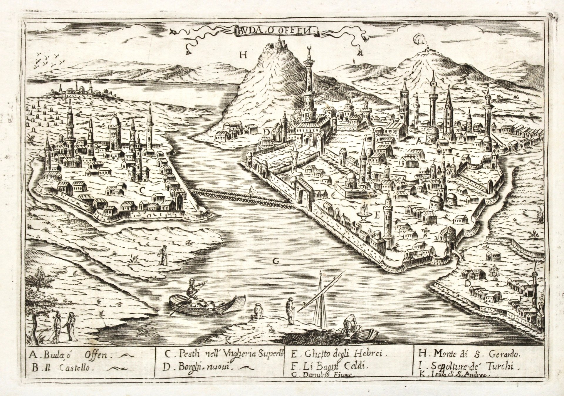 Incisione in rame, mm 140x200. Bellissima veduta prospettica della città di Budapest. Tratta da “Diario della campagna fatta in Ungheria”. Buon esemplare.