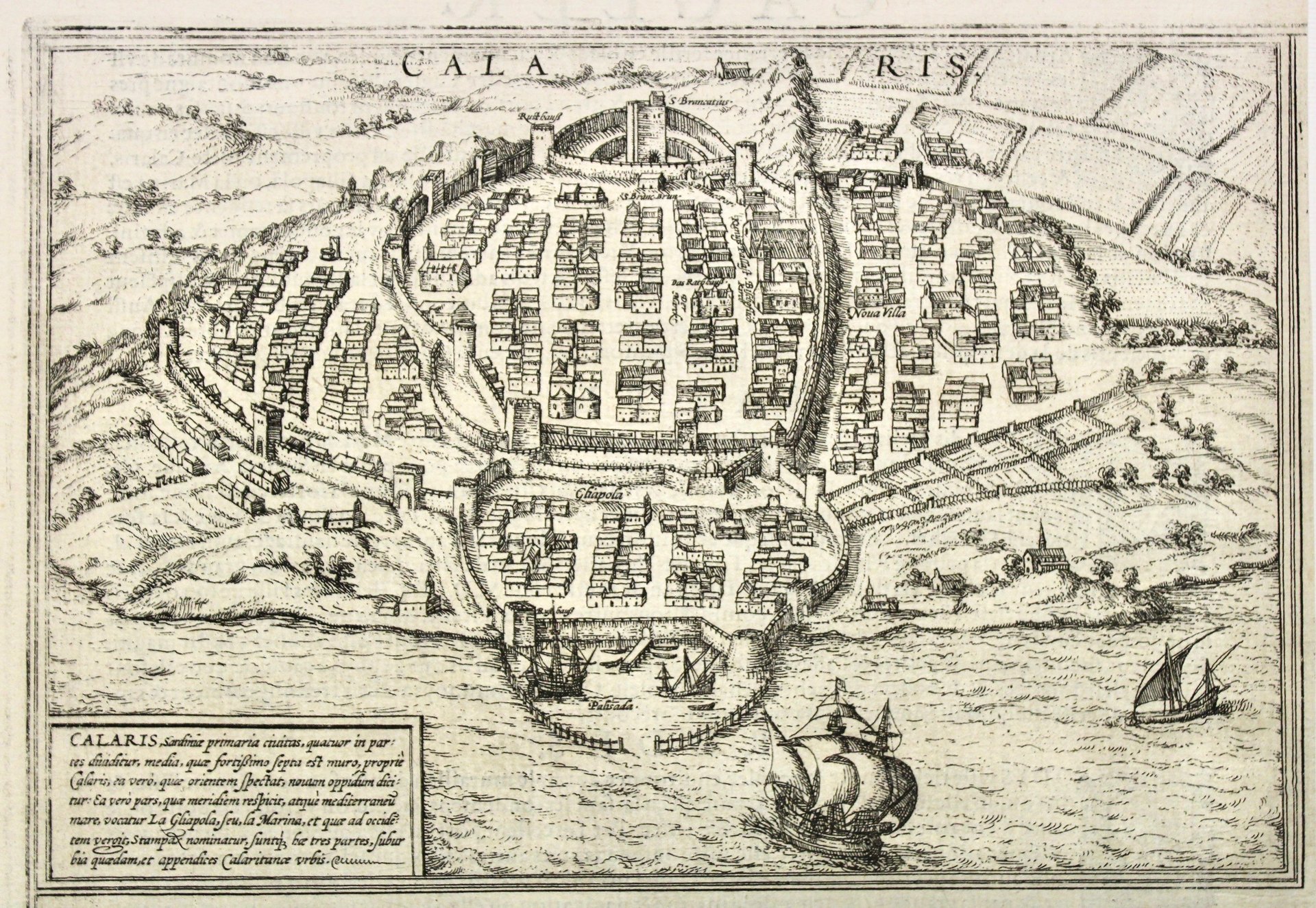 Incisione in rame, mm 165x235, tratta da "Civitates Orbis Terrarum", pietra miliare del vedutismo, pubblicata in anni differenti dal 1572 al 1615 ca. in 6 volumi. Bella veduta della città sarda. Georg Braun (1541-1622) è stato un erudito teologo che compì numerosi viaggi per scopi religiosi e politici nei quali ebbe modo di raccogliere un vasto materiale antropologico e geografico. Franz Hogenberg (1540 ca - 1590 ca) fu un abile incisore fiammingo. Dopo aver collaborato con Ortelio per il "Theatrum Orbis Terrarum", bandito dai Paesi Bassi, si trasferì a Colonia, dove continuò la sua attività di incisore. I due collaborarono per alcuni anni dando alla luce la loro più celebre opera, le "Civitates Orbis Terrarum". Ottimo esemplare con testo latino relativo alla veduta al verso, consueti margini brevi su due lati.<BR>