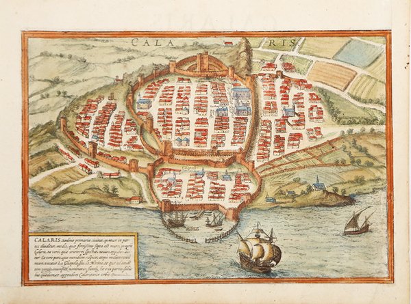 Pianta prospettica di Cagliari derivante dalla xilografia di Sebastina Munster. L’opera è inserita nel ' Civitates Orbis Terrarum, il primo atlante devoto esclusivamente alle piante e vedute delle principali città del mondo. ' Il primo volume delle ' Civitates Orbis Terrarum ' fu pubblicato a Colonia nel 1572. Il sesto e ultimo volume apparve nel 1617. Questo grande atlante di città – cartografia urbana - curato da Georg Braun e inciso in gran parte da Franz Hogenberg, conteneva 546 prospettive, vedute a volo d'uccello e vedute cartografiche di città di tutto il mondo. Franz Hogenberg realizzò le tavole dei primi quattro volumi e Simon van den Neuwel (Novellanus, attivo dal 1580) quelle dei volumi V e VI. Georg Braun (1541-1622), un ecclesiastico di Colonia, fu il principale redattore dell'opera e fu molto aiutato nel suo progetto dalla vicinanza e dal continuo interesse di Abraham Ortelius, il cui ' Theatrum Orbis Terrarum ' del 1570 fu, come raccolta sistematica e completa di mappe di stile uniforme, il primo vero atlante. Le ' Civitates, ' in effetti, erano destinate ad accompagnare il ' Theatrum, ' come indicato dalla somiglianza dei titoli e dai riferimenti contemporanei sulla natura complementare delle due opere. Tuttavia, le ' Civitates ' erano progettate per avere un approccio più popolare, senza dubbio perché la novità di una raccolta di piante e vedute di città rappresentava un'impresa commerciale più rischiosa di un atlante mondiale, per il quale c'erano stati diversi precedenti di successo. Franz Hogenberg (1535-1590) era figlio di un incisore di Monaco che si era stabilito a Malines. Incise la maggior parte delle tavole del ' Theatrum ' di Ortelius e la maggior parte di quelle delle ' Civitates, e potrebbe essere anche indicato come il responsabile dell'origine del progetto. Oltre un centinaio di artisti e cartografi diversi, il più importante dei quali fu l'artista di Anversa Georg Hoefnagel (1542-1600), fornirono i disegni per le tavole delle ' Civitates. Hoefnagel non solo contribuì alla maggior parte del materiale originale per le città spagnole e italiane, ma rielaborò e modificò anche quello di altri collaboratori. Dopo la morte di Hoefnagel, il figlio Jakob continuò il lavoro per le ' Civitates. Gli autori della raccolta si proponevano di raffigurare "non icones et typi urbium", cioè non immagini generiche e tipizzate, "sed urbes ipsae admirabili caelaturae artificio, spectantium oculis subiectae appareant": non intendeva alludere o idealizzare, ma rappresentare fedelmente sulla carta, riprodurre esattamente, e in tempo reale, ciò che l'occhio vede, come annunciato nella prefazione al primo volume delle ' Civitates Orbis Terrarum. Incisione in rame finemente acquarellata, in ottimo stato di conservazione, testo latino al verso. Map of Cagliari, after Sebastian Munster. The work is included in the ' Civitates Orbis Terrarum, the first atlas devoted exclusively to plans and views of the world's major cities. Printed in six volumes between 1572 and 1617 it was so successful and widespread that several editions translated into Latin, German and French were printed. The first volume of the ' Civitates Orbis Terrarum ' was published in Cologne in 1572. The sixth and the final volume appeared in 1617. This great city atlas, edited by Georg Braun and largely engraved by Franz Hogenberg, eventually contained 546 prospects, bird-eye views and map views of cities from all over the world. Fransz Hogenberg produced the plates for the first four books, and Simon van den Neuwel (Novellanus, active since 1580) those for volumes V and VI. Georg Braun (1541-1622), a cleric of Cologne, was the principal editor of the work, and was greatly assisted in his project by the close, and continued interest of Abraham Ortelius, whose ' Theatrum Orbis Terrarum ' of 1570 was, as a systematic and comprehensive collection of maps of uniform style, the first true atlas. The ' Civitates, ' indeed, was intended as a companion for the ' Theatrum, ' as indicated by the similarity in the titles and by contemporary references regarding the complementary nature of two works. Nevertheless, the ' Civitates ' was designs to be more popular in approach, no doubt because the novelty of a collection of city plans and views represented a more hazardous commercial undertaking than a world atlas, for which there had been a number of successful precedents. Franz Hogenberg (1535-1590) was the son of a Munich engraves who settled in Malines. He engraved most of the plates for Ortelius's ' Theatrum ' and the majority of those in the ' Civitates, and may have been responsible for originating the project. Over a hundred of different artists and cartographers, the most significant of whom was Antwerp artist Georg Hoefnagel (1542-1600), engraved the cooper-plates of the ' Civitates ' from drawings. He not only contributed most of the original material for the Spanish and Italian towns but also reworked and modified those of other contributors. After Hoefnagel's death his son Jakob continued the work for the Civitates. The author set out to depict "non icones et typi urbium," that is, not generic and typified images, "sed urbes ipsae admirabili caelaturae artificio, spectantium oculis subiectae appareant": not intended to allude or idealize but to represent faithfully on paper, to reproduce exactly, and in real time, what the eye sees, as announced in the preface to the first volume of ' Civitates Orbis Terrarum. Copper engraving, in very good condition. Cfr. C. de Seta, L'immagine delle città italiane dal XV al XIX secolo, p. 133 n. 11.