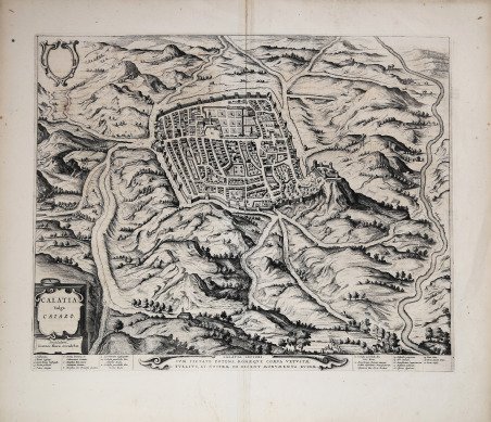 Opera tratta dalla rara prima edizione del Theatrum Civitatum et Admirandorum Italiae ad aevi veteris & praesentis temporis faciem expressum à Ioanne Blaeu G. F., stampata ad Amsterdam nel 1663. Si tratta del primo, monumentale, libro interamente dedicato alla cartografia urbana della sola penisola, preceduto dal “tascabile” ' Italia Hodierna ' di Jodocus Hondius del 1627 e realizzato in probabile concorrenza con Johannes Janssonius che, nel 1657, aveva pubblicato il ' Theatrum praecipuarum urbium, contenente un volume dedicato all’Italia. Johannes Blaeu, durante la sua lunga attività editoriale pubblica tre volumi sulle città italiane. Nel 1663 i primi tre, suddivisi in Stato della Chiesa, Roma e Regno di Napoli e Sicilia. Alla sua morte i suoi eredi danno alla luce altri due volumi datati 1682 incentrati sulle città del Piemonte e della Savoia, poi ristampati da altri editori nel 1693 e 1697. Il francese Pierre Mortier pubblica una ristampa nel 1704/5, intitolata ' Nouveau Theatre de l’Italie. ' L’opera è in quattro volumi e comprende le lastre del Blaeu, ritoccate e modificate in piccola parte, integrate dall’aggiunta di numerose nuove mappe di proprio disegno, raffiguranti le città della parte settentrionale della penisola, racchiuse nel primo volume dell’opera. L’atlante del Mortier venne pubblicato con testo latino, francese ed olandese. Il grande successo dell’opera diede origine ad un’ulteriore ristampa, praticamente identica, curata da Alberts ed edita nel 1724/5. Esemplare con testo descrittivo la verso, della prima edizione del 1663. Bibliografia Koeman, ' Atlas Neerlandici, pp. 332/338; Cremonini pp. 49-52, 39. Map taken form the rare first edition of Theatrum Civitatum et Admirandorum Italiae ad aevi veteris & praesentis temporis faciem expressum à Ioanne Blaeu G. F., printed by Johannes Blaeu, Amsterdam, 1663. This is the first monumental town book entirely covering Italy, preceded by the "pocket-size" ' Italia Hodierna ' by Jodocus Hondius jr. (1627) and realized in likely competition with Johannes Janssonius who, in 1657, published the ' Theatrum praecipuarum urbium, ' containing a volume dedicated to Italy. Johannes Blaeu, during his long editorial activity published three volumes on Italian cities. In 1663 the first three, divided into the State of the Church, Rome and the Kingdom of Naples and Sicily. At his death his heirs gave birth to two more volumes dated 1682 focused on the cities of Piedmont and Savoy, then reprinted by other publishers in 1693 and 1697. Pierre Mortier publishes a reprint in 1704/5, entitled ' Nouveau Theatre de l'Italie. The work is in four volumes and includes the plates of Blaeu, retouched and modified in small part, supplemented by the addition of several new maps of his own design, depicting the cities of the northern part of the peninsula, enclosed in the first volume of the work. Mortier's atlas was published with Latin, French and Dutch texts. The great success of the work gave rise to a further reprint, virtually identical, edited by R. Alberts and published in 1724/5. Example of the first edition, showing descriptive text on the back of the map. Literature Koeman, ' Atlas Neerlandici, pp. 332/338; Cremonini pp. 49-52, 39. Cfr.