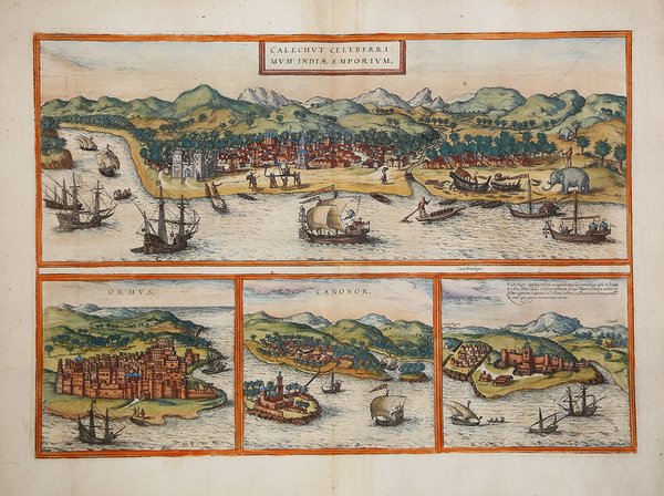 Suggestivo gruppo di 4 vedute che illustrano un viaggio dall'Africa alle regioni commerciali dell'Est. La vista dall'alto mostra Calcutta, l'importante centro commerciale del XVI secolo, vicino a Madras, che era allora un importante punto di scambio portoghese. Sotto si trovano le vedute più piccole di Ormuz, all'ingresso del Golfo Persico, Canonor in India e la fortezza portoghese di El Mina, in Africa occidentale. L’opera è inserita nel ' Civitates Orbis Terrarum, il primo atlante devoto esclusivamente alle piante e vedute delle principali città del mondo. ' Il primo volume delle ' Civitates Orbis Terrarum ' fu pubblicato a Colonia nel 1572. Il sesto e ultimo volume apparve nel 1617. Questo grande atlante di città – cartografia urbana - curato da Georg Braun e inciso in gran parte da Franz Hogenberg, conteneva 546 prospettive, vedute a volo d'uccello e vedute cartografiche di città di tutto il mondo. Franz Hogenberg realizzò le tavole dei primi quattro volumi e Simon van den Neuwel (Novellanus, attivo dal 1580) quelle dei volumi V e VI. Georg Braun (1541-1622), un ecclesiastico di Colonia, fu il principale redattore dell'opera e fu molto aiutato nel suo progetto dalla vicinanza e dal continuo interesse di Abraham Ortelius, il cui ' Theatrum Orbis Terrarum ' del 1570 fu, come raccolta sistematica e completa di mappe di stile uniforme, il primo vero atlante. Le ' Civitates, ' in effetti, erano destinate ad accompagnare il ' Theatrum, ' come indicato dalla somiglianza dei titoli e dai riferimenti contemporanei sulla natura complementare delle due opere. Tuttavia, le ' Civitates ' erano progettate per avere un approccio più popolare, senza dubbio perché la novità di una raccolta di piante e vedute di città rappresentava un'impresa commerciale più rischiosa di un atlante mondiale, per il quale c'erano stati diversi precedenti di successo. Franz Hogenberg (1535-1590) era figlio di un incisore di Monaco che si era stabilito a Malines. Incise la maggior parte delle tavole del ' Theatrum ' di Ortelius e la maggior parte di quelle delle ' Civitates, e potrebbe essere anche indicato come il responsabile dell'origine del progetto. Oltre un centinaio di artisti e cartografi diversi, il più importante dei quali fu l'artista di Anversa Georg Hoefnagel (1542-1600), fornirono i disegni per le tavole delle ' Civitates. Hoefnagel non solo contribuì alla maggior parte del materiale originale per le città spagnole e italiane, ma rielaborò e modificò anche quello di altri collaboratori. Dopo la morte di Hoefnagel, il figlio Jakob continuò il lavoro per le ' Civitates. Gli autori della raccolta si proponevano di raffigurare "non icones et typi urbium", cioè non immagini generiche e tipizzate, "sed urbes ipsae admirabili caelaturae artificio, spectantium oculis subiectae appareant": non intendeva alludere o idealizzare, ma rappresentare fedelmente sulla carta, riprodurre esattamente, e in tempo reale, ciò che l'occhio vede, come annunciato nella prefazione al primo volume delle ' Civitates Orbis Terrarum. Incisione in rame, finemente colorata a mano, in ottimo stato di conservazione. Striking group of 4 city views, illustrating a trip from Africa to the trading regions of East. The top view shows Calecut, the important 16th Century Indian trading center, near Madras, which was then an important Portugese trading post, at a time when the Portugese made a fortune from trade with the East. It shows the town rising out of a jungle of palm trees. An elephant with a mahout is watching while boats are constructed on the beach, and Asian and European vessels just offshore are shown in some detail. Beneath the view of Calecut are smaller views of Ormuz at the entrance of the Persian Gulf, Canonor in India, and the Portuguese fortress of El Mina in West Africa. The work is included in the ' Civitates Orbis Terrarum, the first atlas devoted exclusively to plans and views of the world's major cities. Printed in six volumes between 1572 and 1617 it was so successful and widespread that several editions translated into Latin, German and French were printed. The first volume of the ' Civitates Orbis Terrarum ' was published in Cologne in 1572. The sixth and the final volume appeared in 1617. This great city atlas, edited by Georg Braun and largely engraved by Franz Hogenberg, eventually contained 546 prospects, bird-eye views and map views of cities from all over the world. Fransz Hogenberg produced the plates for the first four books, and Simon van den Neuwel (Novellanus, active since 1580) those for volumes V and VI. Georg Braun (1541-1622), a cleric of Cologne, was the principal editor of the work, and was greatly assisted in his project by the close, and continued interest of Abraham Ortelius, whose ' Theatrum Orbis Terrarum ' of 1570 was, as a systematic and comprehensive collection of maps of uniform style, the first true atlas. The ' Civitates, ' indeed, was intended as a companion for the ' Theatrum, ' as indicated by the similarity in the titles and by contemporary references regarding the complementary nature of two works. Nevertheless, the ' Civitates ' was designs to be more popular in approach, no doubt because the novelty of a collection of city plans and views represented a more hazardous commercial undertaking than a world atlas, for which there had been a number of successful precedents. Franz Hogenberg (1535-1590) was the son of a Munich engraves who settled in Malines. He engraved most of the plates for Ortelius's ' Theatrum ' and the majority of those in the ' Civitates, and may have been responsible for originating the project. Over a hundred of different artists and cartographers, the most significant of whom was Antwerp artist Georg Hoefnagel (1542-1600), engraved the cooper-plates of the ' Civitates ' from drawings. He not only contributed most of the original material for the Spanish and Italian towns but also reworked and modified those of other contributors. After Hoefnagel'
