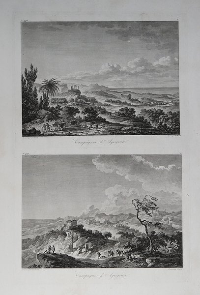 Veduta pubblicata nel ' Voyage Pittoresque ou description des Royaumes de Naples et de Sicile, opera in 5 volumi per la prima volta stampati a Parigi tra 1781 e il 1786. Richard de Saint-Non conobbe, durante il suo viaggio a Roma, i due già celebri pittori francesi Jean Honoré Fragonard e Hubert Robert, con i quali prosegue il suo viaggio per tutto il paese. Da questa grande amicizia nasce l’idea e la collaborazione per l’ambizioso progetto di documentare graficamente tutti i principali monumenti dell’Italia Meridionale e della Sicilia. Da qui, tra il 1781 ed il 1786, con l’aiuto di numerosi ed importanti architetti, pittori ed incisori, venne alla luce il Voyage Pittoresque ou description des Royaume de Naples et de Sicilie, opera composta di cinque volumi che uscirono annualmente. Incredibile sforzo tipografico, l’opera raccoglie quasi per intero gli appunti di viaggio del Saint-Non, adeguatamente assemblati e corretti; il corpus grafico è composto di ben 542 incisioni all’acquaforte e bulino, opera dei principali artisti di riproduzione del periodo. Da un punto di vista editoriale l’iniziativa riscuote immediatamente un grandissimo successo: il libro diviene un vero e proprio modello tipografico, sul quale sono basate diverse pubblicazioni dell’impero napoleonico. Dal punto di vista artistico le vedute, i paesaggi e le rovine conservano, e non può essere altrimenti, lo stile pittorico e romantico del Fragonard, del Robert, del Desprez, e di tutti gli altri artisti che collaborano nella realizzazione di questa monumentale opera. Il notevole successo commerciale della raccolta è testimoniato dalla ristampa, tra il 1795 ed il 1798, delle sole tavole pittoriche. Un’ulteriore edizione è stampata nel 1829 dal Dufour. Esemplare tratto dal ' Voyage Pittoresque, ' seconda edizione del 1795/98, priva dell’indicazione del privilegio reale. ' Acquaforte, stampata su carta vergata coeva, leggere ossidazioni, per il resto in ottimo stato di conservazione. View taken from the Voyage Pittoresque ou description des Royaume de Naples et de Sicilie by Richard de Saint-Non. During his trip to Rome, Richard de Saint-Non met two already famous French painters, Jean Honoré Fragonard and Hubert Robert, with whom he travelled along Italy. Their friendship led to the cooperation for the ambitious project of depicting all the main monuments of Southern Italy and Sicily. Between 1781 and 1786, with the assistance of many contemporary artists, he realized the Voyage Pittoresque ou description des Royaume de Naples et de Sicilie, a five volumes work published annually. As a result of a great typographical effort, the work is a collection of Sain-Non’s travelling notes; the graphic part is made up of 542 engravings and etchings, realized by the most important artists of the period. The work is immediately successful, for the book became a new typographical model for the following publications. From an artistic point of view, the views, landscapes and antiquity keep the Romantic pictorial style of Fragonard, Robert, Desprez and all the other artists that took part in this monumental project. The re-issue, between 1795 and 1798, of the pictorial plates, witnesses the great success of this project. A re-issue of the whole work was edited in 1829 by Dufour. Example taken from the second edition of the work, printed in Paris 1795/98; the plates are without the Royal priviledge. ' Etching, printed on contemporary laid paper, light foxing, otherwise good condition. Cfr.