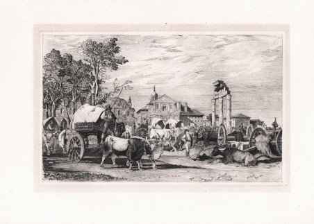 Acquaforte, tratta da 'A series of subiects peculiar to the campagna of Rome and Pontine marshes designed from nature and etched by C. Coleman', edito a Roma nel 1850. Magnifica prova, impressa su carta cina applicata su cartoncino, pieni margini, in perfetto stato di conservazione. Charles Coleman è stato un pittore inglese di paesaggi e animali, nato a Pontefract, nello Yorkshire, in Inghilterra. Fu attivo principalmente a Roma, dove fu un'importante influenza su Nino Costa e diede un contributo significativo alla formazione della Scuola di pittura di Campagna Romana. Dalle brulle colline dello Yorkshire, Charles Coleman arriva a Roma nel 1831 e si mostra un pittore appassionato del territorio che circonda l’urbe, pubblicando alla metà del secolo, presso la libreria Spithover, un ricco volume con 53 acqueforti: A series of subiects peculiar to the campagna of Rome and Pontine marshes designed from nature and etched by C. Coleman. I paesaggi che Coleman rappresenta somigliano molto alle vedute desolate del suo Yorkshire, “ventose e abitate soltanto dall’erica”. Nella gran parte delle vedute dell’artista inglese il paesaggio si presenta con vivaci contrapposti, facendo sì che Coleman rappresenti un vero e proprio maestro per una o due generazioni di pittori romani e non solo. Era sprezzante dell'insegnamento accademico, credendo che l'osservazione dalla natura fosse la migliore educazione per un artista. Espose cinque volte alla Royal Academy di Londra, per l'ultima volta nel 1869. Etching from the 'A series of subiects peculiar to the campagna of Rome and Pontine marshes designed from nature and etched by C. Coleman', printed in Rome in 1850. A fine ' work, printed on China paper and laid on cardboard, full margins, in perfect condition. Charles Coleman was an English landscape and animal painter, born in Pontefract, Yorkshire, England. He was active primarily in Rome, where he was an important influence on Nino Costa and made a significant contribution to the formation of the School of "Campagna Romana" Painting. From the barren hills of Yorkshire, Charles Coleman arrived in Rome in 1831 and showed himself a passionate painter of the territory surrounding the urbe, publishing in the middle of the century, at the Spithover bookstore, a rich volume with 53 etchings: A series of subiects peculiar to the countryside of Rome and Pontine marshes designed from nature and etched by C. Coleman. The landscapes that Coleman depicts are very similar to the desolate views of his Yorkshire, "windy and inhabited only by heather". In most of the English artist's views, the landscape is presented with vivid contrasts, making Coleman a true master for a generation or two of painters in Rome and beyond. He was contemptuous of academic teaching, believing that observation from nature was the best education for an artist. He exhibited five times at the Royal Academy in London, for the last time in 1869. Cfr.