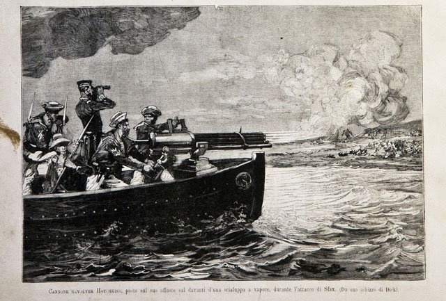Cannone revolver Hotchkiss, posto sul suo affusto sul davanti d’una scialuppa a vapore, durante l’attacco di Sfax