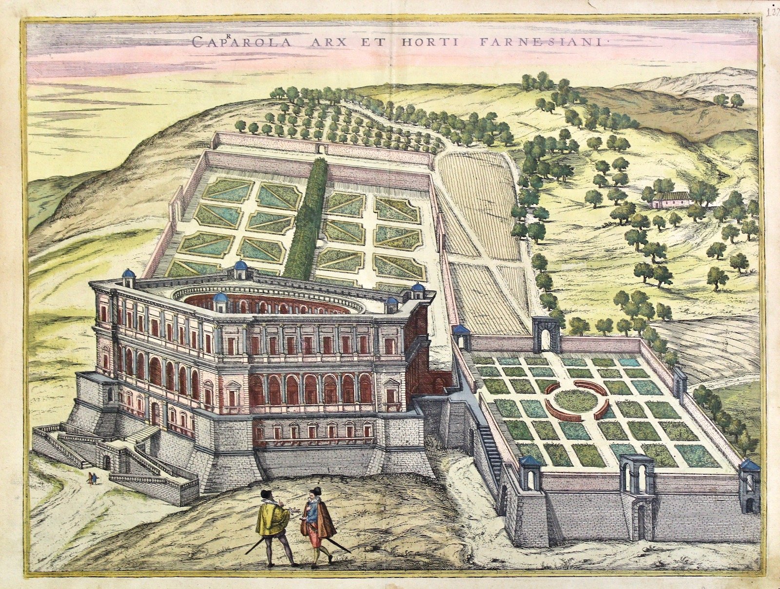 Incisione in rame, finemente colorata, 385x505. Bella veduta prospettica del palazzo ed annessi giardini, tratta da "Civitates Orbis Terrarum". Ottime condizioni generali. Due piccoli restauri professionali.