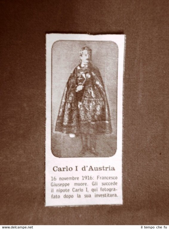 Stampa estratta da rivista anni '60. .stampa che ha quindi oltre 55 anni! Carlo I d'Austria Succede al Trono a Francesco Giuseppe il 16 novembre 1916 II1957-004 Dimensioni Cm 4,50 x 10,00 Qualora vogliate delle scansioni migliori contattateci, soddisferemo ogni vostra richiesta. Paypal Carta di credito Bonifico bancario Spedizione con posta ordinaria o tracciata scelta dall'acquirente nel momento del pagamento
