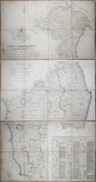 Carta Corografica dello Stato Pontificio indicante le Dogane, i posti armati dalla truppa di Finanza, le strade Doganali, la fascia bimiliare di divieto, e alle Dogane estere che corrispondono alle Pontificie [in alto a sinistra del primo foglio] firma in lastra di Gaetano Spinetti (disegnatore) e di Alessandro Moschetti (incisore) [ai due angoli inferiori, esternamente al margine); priva di altri dati editoriali, ma stampata a Roma, probabilmente dalla Calcografia Camerale, nel 1837 circa. La carta è frutto della collaborazione tra Gaetano Spinetti -disegnatore e cartografo attivo a Roma dal 1828 al 1860 -, Giuseppe Ponzi (1805-1885) - medico e naturalista, fondatore del Museo di Geologia dell’Università degli studi La Sapienza in Roma e primo docente della cattedra di Geologia istituita nel 1860 da Pio IX - e Alessandro Moschetti - calcografo pontificio, incisore attivo a Roma dal 1848 al 1864. Orientazione ruotata in senso orario di circa 20°, data da un'asta recante il vessillo pontificio posta nel quadrante in alto a sinistra del 1º foglio, con il nord e il sud indicati alle due estremità; margine non graduato; scala naturale 1: 266 000 ?; scala grafica in miglia romane moderne [sotto la tabella dei segni convenzionali, nel I foglio]; legenda dei "SEGNI CONVENZIONALI" [nel Il foglio, a sinistra, in corrispondenza del cartiglio al foglio precedente]; tabella recante l'Indice delle Strade Legali di Comunicazione fra le Dogane Pontificie e le Dogane Estere con la Distanza distinta in miglia nonché dei Porti e Scali Legali per la Parte dello Stato Confinante col Mare Adriatico e Mediterraneo" [all'angolo inferiore destro del III foglio]. Incisione su rame, a bulino, senza testo al verso, senza coloritura, in 3 fogli giuntabili [565 x 925 mm (singolo foglio), 925 x 1695 mm (totale dei 3 fogli)]. Applicata su tela, più volte ripiegata, racchiusa in astuccio coevo in cartone marmorizzato. “Carta topografica disegnata durante il pontificato di Gregorio XVI (1831-1846), composta da 3 fogli, che vanno a formare la rappresentazione dell'intero Stato Pontificio in quegli anni. Questa carta risulta essere particolarmente precisa nella delimitazione dei confini tra delegazioni allora vigenti e nell'attenta rappresentazione delle vie di comunicazione principali e secondarie, rese con simboli diversi in base alla loro rilevanza. I centri abitati sono tutti precisamente ubicati e indicati con il medesimo simbolo ad eccezione delle maggiori città, e la loro importanza si rileva dalla diversa grandezza dei caratteri tipografici utilizzati. Nel primo foglio, in alto a sinistra, compare il dettagliato titolo, che informa puntualmente sul contenuto della carta. Il titolo è sormontato dallo stemma papale di Gregorio XVI, sorretto da due putti. Nel foglio centrale è riportata la tabella dei Segni Convenzionali, in alto a sinistra. Nell'ultimo foglio, in basso a sinistra, viene raffigurata la Delegazione di Benevento, senza margine graduato, e a destra compare una grande tabella con 'Indice delle Strade Legali di Comunicazione fra le Dogane Pontificie e le Dogane Estere con la Distanza distinta in miglia nonché dei Porti e Scali Legali per la Parte dello Stato Confinante col Mare Adriatico e Mediterraneo” (cfr. M. G. Cocco in Associazione Roberto Almagià (a cura di) “L’Italia di mezzo, La cartografia storica del Centro Italia dal XVI al XIX secolo nelle collezioni private”, p. 88. “La carta si compone di 3 fogli per una misura complessiva di mm 1695x925. In alto a sinistra, nel primo foglio, il titolo "Carta Corografica dello Stato Pontificio indicante le Dogane, i Posti Armati della Truppa di Finanza, le strade Doganali, la fascia bimigliare di divieto, e alle Dogane estere che corrispondono alle Pontificie". Sopra al titolo, due putti alati sor- reggono lo stemma di papa Gregorio XVI (1831-1846) sormontato dai simboli pontifici. Nel foglio centrale, a sinistra la tabella dei segni convenzionali con i simb. Carta Corografica dello Stato Pontificio indicante le Dogane, i posti armati dalla truppa di Finanza, le strade Doganali, la fascia bimiliare di divieto, e alle Dogane estere che corrispondono alle Pontificie ' [in alto a sinistra del primo foglio] firma in lastra di Gaetano Spinetti (disegnatore) e di Alessandro Moschetti (incisore) [ai due angoli inferiori, esternamente al margine); priva di altri dati editoriali, ma stampata a Roma, probabilmente dalla Calcografia Camerale, nel 1837 circa. La carta è frutto della collaborazione tra Gaetano Spinetti -disegnatore e cartografo attivo a Roma dal 1828 al 1860 -, Giuseppe Ponzi (1805-1885) - medico e naturalista, fondatore del Museo di Geologia dell’Università degli studi La Sapienza in Roma e primo docente della cattedra di Geologia istituita nel 1860 da Pio IX - e Alessandro Moschetti - calcografo pontificio, incisore attivo a Roma dal 1848 al 1864. Orientazione ruotata in senso orario di circa 20°, data da un'asta recante il vessillo pontificio posta nel quadrante in alto a sinistra del 1º foglio, con il nord e il sud indicati alle due estremità; margine non graduato; scala naturale 1: 266 000 ?; scala grafica in miglia romane moderne [sotto la tabella dei segni convenzionali, nel I foglio]; legenda dei "SEGNI CONVENZIONALI" [nel Il foglio, a sinistra, in corrispondenza del cartiglio al foglio precedente]; tabella recante ' l'Indice delle Strade Legali di Comunicazione fra le Dogane Pontificie e le Dogane Estere con la Distanza distinta in miglia nonché dei Porti e Scali Legali per la Parte dello Stato Confinante col Mare Adriatico e Mediterraneo" [all'angolo inferiore destro del III foglio]. Incisione su rame, a bulino, senza testo al verso, senza coloritura, in 3 fogli giuntabili [565 x 925 mm (singolo foglio), 925 x 1695 mm (totale dei 3 fogli)]. Applicata su tela, più volte ripiegata, racchiusa in astuccio coevo in cartone marmorizzato. “Carta topografica disegnata durante il pontificato di Gregorio XVI (1831-184