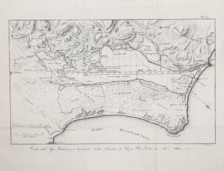 Carta delle Paludi Pontine tratta dalle Opere idrauliche del cavaliere Vittorio Fossombroni con una dissertazione idrometrica del cav. Pietro Paoli, stampato a Bologna da Jacopo Marsili nel 1824. Nel quarto capitolo dell’opera il Fossombroni pubblica il Saggio sulla bonificazione delle Paludi Pontine. La carta si riferisce alla regione già con le modifiche apportate sotto papa Pio Sesto e venne ideata, probabilmente, intorno al 1811, quando Fossombroni presiedette la Commissione per la bonifica delle Paludi Pontine. Vittorio Fossombroni (1754-1844) dopo la laurea all’Università di Pisa, dove si laureò nel 1778 in ' utroque jure, frequentò, nell'ambiente fiorentino, un gruppo di studiosi di problemi di idraulica e ingegneria e di matematici fra cui Giovanni Fabbroni e Leonardo Ximenes; divenne Socio dell'Accademia dei Georgofili, i cui membri condividevano da tempo l'interesse per i problemi delle bonifiche. In particolare, l'attenzione di Fossombroni si rivolse alle condizioni dell'Aretino, sua zona di origine, con lo scopo del risanamento delle zone paludose della Valdichiana e al riguardo sviluppò un piano sistematico di bonifica idraulica, attraverso il metodo delle colmate. Nel 1782 fu nominato Visitatore dei beni dell'Ordine di S. Stefano in Val di Chiana, avendo così l'opportunità di studiare sul campo le teorie in materia di “scienza delle acque”. Dal 1784 divenne membro dell'Accademia delle Scienze dei XL, sulle cui «Memorie» pubblicò nel 1786 i suoi ' Studi sopra la distribuzione delle alluvioni. Il Granduca Leopoldo lo nominò nel 1788 Soprintendente alla bonifica della Val di Chiana dopo la lettura del manoscritto delle ' Memorie idraulico-storiche sulla Val di Chiana ' (pubblicato l'anno seguente) incarico che mantenne fino al 1828 e per il quale si dimise nel 1793 dalla carica di Visitatore dei beni dell'Ordine. Nel 1811 presiedette la Commissione per la bonifica delle Paludi Pontine. Acquaforte, pieghe di carta come pubblicata, in ottimo stato di conservazione. Carta delle Paludi Pontine tratta dalle Opere idrauliche del cavaliere Vittorio Fossombroni con una dissertazione idrometrica del cav. Pietro Paoli, stampato a Bologna da Jacopo Marsili nel 1824. Nel quarto capitolo dell’opera il Fossombroni pubblica il Saggio sulla bonificazione delle Paludi Pontine. La carta si riferisce alla regione già con le modifiche apportate sotto papa Pio Sesto e venne ideata, probabilmente, intorno al 1811, quando Fossombroni presiedette la Commissione per la bonifica delle Paludi Pontine. Vittorio Fossombroni (1754-1844) dopo la laurea all’Università di Pisa, dove si laureò nel 1778 in ' utroque jure, frequentò, nell'ambiente fiorentino, un gruppo di studiosi di problemi di idraulica e ingegneria e di matematici fra cui Giovanni Fabbroni e Leonardo Ximenes; divenne Socio dell'Accademia dei Georgofili, i cui membri condividevano da tempo l'interesse per i problemi delle bonifiche. In particolare, l'attenzione di Fossombroni si rivolse alle condizioni dell'Aretino, sua zona di origine, con lo scopo del risanamento delle zone paludose della Valdichiana e al riguardo sviluppò un piano sistematico di bonifica idraulica, attraverso il metodo delle colmate. Nel 1782 fu nominato Visitatore dei beni dell'Ordine di S. Stefano in Val di Chiana, avendo così l'opportunità di studiare sul campo le teorie in materia di “scienza delle acque”. Dal 1784 divenne membro dell'Accademia delle Scienze dei XL, sulle cui «Memorie» pubblicò nel 1786 i suoi ' Studi sopra la distribuzione delle alluvioni. Il Granduca Leopoldo lo nominò nel 1788 Soprintendente alla bonifica della Val di Chiana dopo la lettura del manoscritto delle ' Memorie idraulico-storiche sulla Val di Chiana ' (pubblicato l'anno seguente) incarico che mantenne fino al 1828 e per il quale si dimise nel 1793 dalla carica di Visitatore dei beni dell'Ordine. Nel 1811 presiedette la Commissione per la bonifica delle Paludi Pontine. Acquaforte, pieghe di carta come pubblicata, in ottimo stato di conservazione. Cfr.