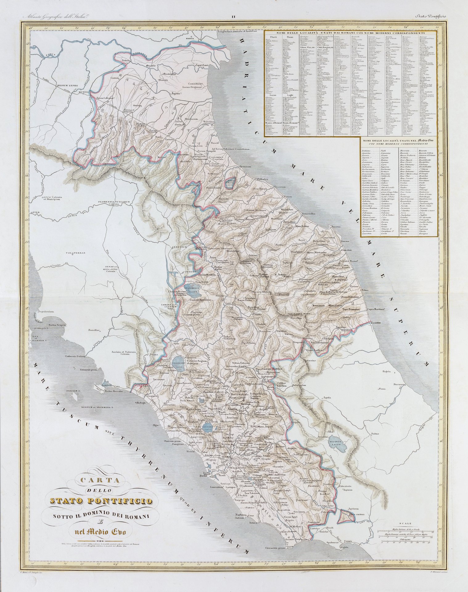 Incisione in rame di Maina e Stanghi, mm 695x545, dipinta a mano. Da Atlante geografico dell’Italia. Attilio Zuccagni-Orlandini (1784-1872) fu un cartografo e geografo italiano. La sua opera principale è senza dubbio la Corografia fisica, storica e statistica dell’Italia e delle sue isole, cui l’incisione appartiene. La Corografia si compone di dodici tomi (senza contare i vari supplementi), stampati tra il 1833 e il 1845, ed è corredata da un atlante in due volumi e da numerose mappe geografiche e topografiche, nonché da tavole illustrative.