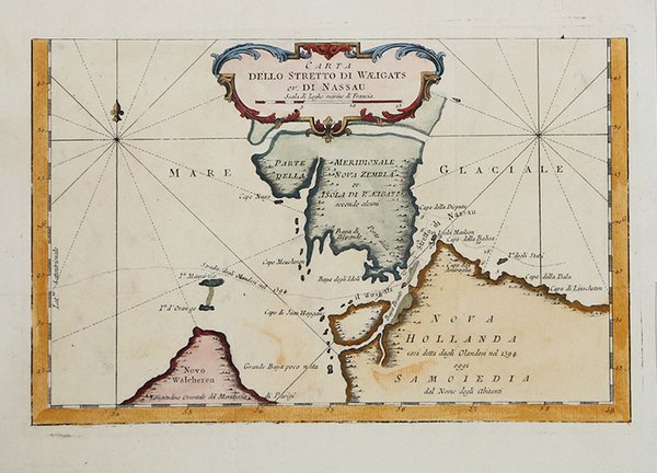 Carta disegnata da Jacques Nicolas Bellin, pubblicata come tavola dell'edizione francese del 1757 di "Histoire generale des voyages, ou nouvelle collection de toutes les relations de voyages par mer et par terre s" di Antoine François Prévost, più noto sotto il nome di abbé Prévost.La raccolta, in più volumi, è stampata per la prima volta A Paris: chez Didot, 1746-1753.L’opera completa - in-12° - proseguirà le pubblicazioni fino a raggiungere, nel 1789, una consistenza di 80 volumi. Colossale lavoro a carattere enciclopedico di ricerca svolto dall’Autore, cui va anche il merito di aver divulgato numerosi racconti inediti sulla scoperta dell’Australia da parte degli olandesi e i resoconti dei viaggi attraverso il Pacifico, fra cui quelli di Magellano e Schouten.L'opera è corredata da quasi 300 illustrazioni di popolazioni, vedute, e costumi di tutto il mondo e da 113 splendide mappe, opera di Jaques-Nicolas Bellin. Jacques-Nicolas Bellin è stato uno dei cartografi più importanti del XVIII secolo; nacque a Parigi, e fu un membro dell’Académie de Marine e della Royal Society di Londra. Nel 1721, all’età di 18 anni, fu nominato idrografo (cartografo capo) alla Marina Militare francese. Nell’agosto del 1741, divenne il primo Ingénieur de la Marine del Depot des cartes et plans et de la Marine (l’ufficio idrografico francese) e fu nominato ufficiale idrografico del Re di Francia. Durante il suo servizio gli furono commissionati i rilievi delle coste francesi prima, e successivamente quelle di tutto il mondo conosciuto. La sua produzione fu immensa e le sue carte nautiche, di grande qualità, apparvero in più edizioni oltre la fine del diciottesimo secolo. Le carte nautiche venivano vendute separatamente e recavano tutte l’inconfondibile timbro dell’ancora e la corona del Depot Generale de la Marine. Incisione in rame, in ottime condizioni. Map drawn by Jacques Nicolas Bellin, published as a plate of the French edition of 1757 of "Histoire General des Voyages, ou nouvelle collection de toutes les relations de voyages par mer et par terre s" by Antoine François Prévost, better known under the name of abbé Prévost.The collection, in several volumes, is printed for the first time A Paris: chez Didot, 1746-1753.The complete work - in 12th - will continue the publications until it reaches, in 1789, a consistency of 80 volumes. A colossal encyclopedic research work carried out by the author, which also deserves credit for having published numerous unpublished stories about the discovery of Australia by the Dutch and reports of journeys across the Pacific, including those of Magellan and Schouten.The work is accompanied by nearly 300 illustrations of populations, views, and costumes from around the world and by 113 splendid maps, by Jaques-Nicolas Bellin. Bellin was one of the most important cartographers of the 18th century; he was born in Paris, and was a member of the Académie de Marine and the Royal Society of London. In 1721, at the age of 18, he was appointed hydrographer (chief cartographer) to the French Navy. In August 1741, he became the first Ingénieur de la Marine of the Depot des cartes et plans et de la Marine (the French hydrographic office) and was appointed hydrographic officer to the King of France. During his service he was commissioned to survey first the French coastline and later those of the entire known world. His output was immense, and his high-quality nautical charts appeared in multiple editions beyond the end of the 18th century. ' Copperplate, in good conditions. Cfr.