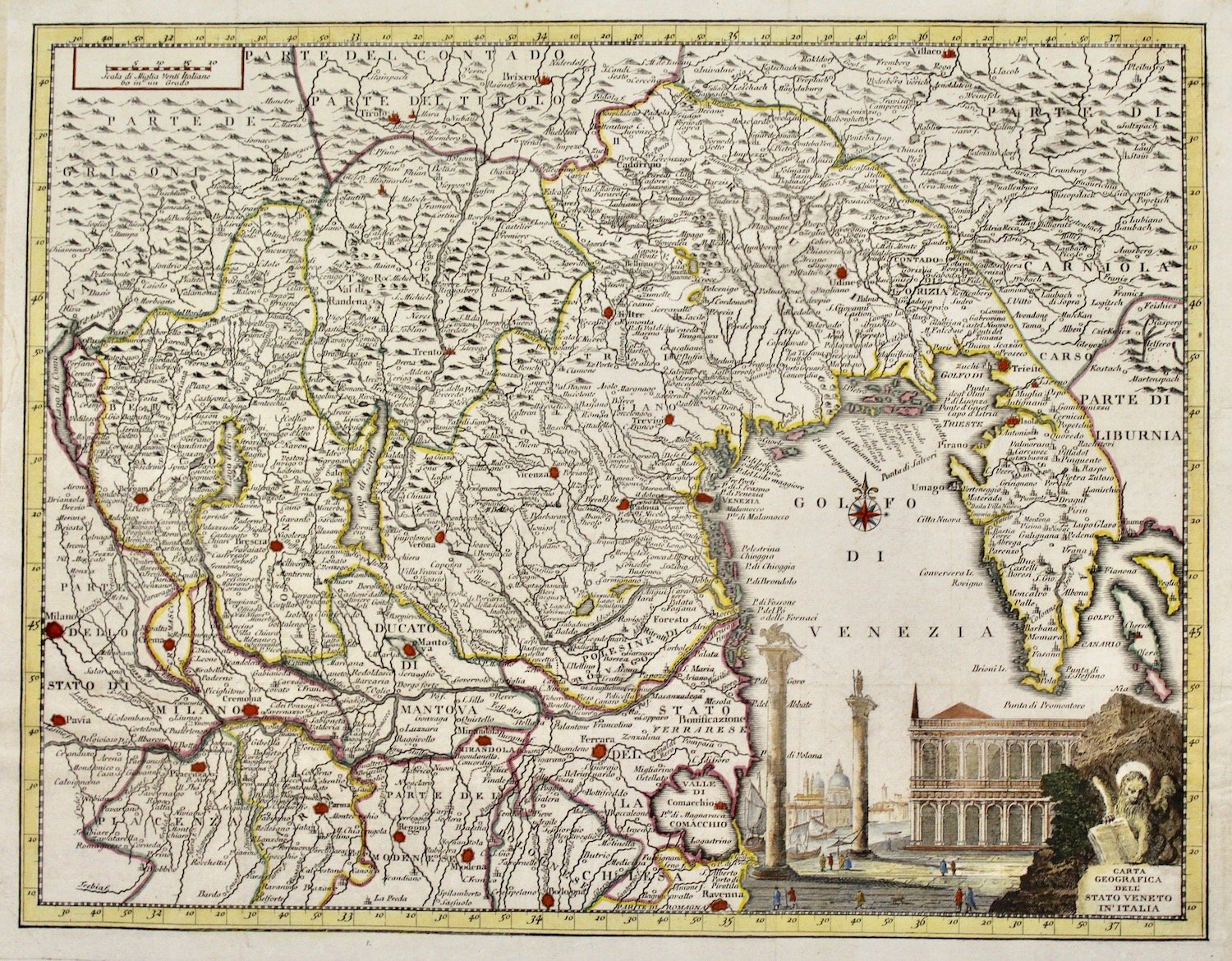 Incisione in rame, dipinta a mano, mm 325x420. Tratta da "Atlante novissimo". Ottimo esemplare.
