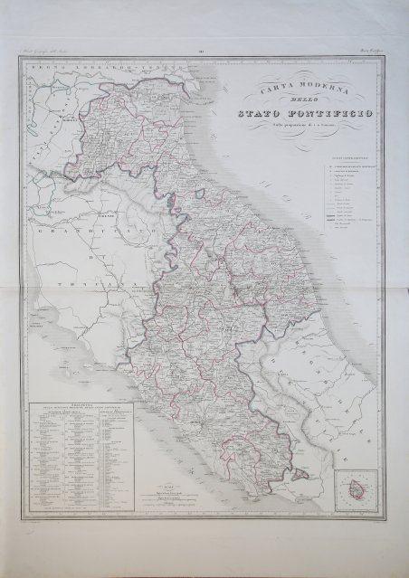 Carta geografica tratta dall’Atlante geografico degli Stati italiani delineato sopra le migliori e più moderne mappe per servire di corredo alla corografia fisica storica e statistica dell'Italia, di Attilio Zuccagni Orlandini ' stampato a Firenze, presso gli editori, 1844. In 2° massimo, 2 voll. Il primo volume contenente le carte dell’Italia Superiore in 52 fogli, il secondo volume quelle dell’Italia Inferiore in 77 fogli. Attilio Zuccagni Orlandini (1784-1872) nacque a Fiesole con il nome di Giuseppe Orlandini. In seguito all’adozione da parte del facoltoso zio materno Attilio Zuccagni (1754-1807), botanico e georgofilo, assunse il nome di Attilio Zuccagni Orlandini. La sua più importante opera è la relazione geografico-cartografica di tutti gli Stati preunitari italiani, la grandiosa ' Corografia fisica, storica e statistica dell’Italia e delle sue Isole ' (Firenze 1835-1845), in dodici volumi per diciannove tomi, con un volume introduttivo sull’intera penisola italiana. L’opera costituì la summa delle centinaia di opere geografiche generali, regionali e locali allora disponibili e presentava, per ogni Stato preunitario, la trattazione fisica, storica, topografica e un inquadramento statistico. Nel 1844-45, la ' Corografia ' fu arricchita con cinque volumi di cartografie, vedute e altre illustrazioni di luoghi e monumenti: ' Atlante geografico degli Stati italiani delineato sopra le migliori e più moderne mappe ' (due volumi con 144 tavole inclusa la grande carta della penisola in 15 fogli) e ' Atlante illustrativo ossia raccolta dei principali monumenti italiani antichi, del medio evo e moderni e di alcune vedute pittoriche ' (tre volumi con 413 illustrazioni, stampate su 269 fogli). Le tavole furono incise, sempre a Firenze, in due apposite officine, da quattro valenti artisti lombardi (Vittorio Angeli, Giacinto Maina, Pietro Manzoni e Giuseppe Pozzi). Soprattutto il primo dei due atlanti rappresenta, ancora oggi, una pietra miliare nella storia della cartografia e dell’iconografia geografica italiana. Fu veramente ‘un’ardua impresa’, dal momento che spesso mancavano ancora (come, ad esempio, per il ' Ducato di Lucca ' e lo ' Stato Pontificio) prodotti cartografici compiutamente geometrici. I due prodotti furono presentati ai Georgofili nel 1843 e nel 1844, insieme alla mappa della Repubblica di San Marino. L’opera si rivelò oltremodo costosa e non ottenne il successo commerciale sperato, ma servì da base per tante altre iniziative editoriali successive che vi attinsero, talora senza neppure rispettarne i diritti d’autore. Incisione in rame, coloritura coeva dei contorni, lievi ossidazioni, per il resto in ottimo stato di conservazione. ' Bibliografia Cfr. Anna Guarducci - ' Dizionario Biografico degli Italiani ' - Volume 100 (2020); ' F. Ronca e A. Sorbini (a cura di) "Le antiche terre del Ducato di Spoleto", p. 268, n. 120. Map taken from the ' Atlante geografico degli Stati italiani delineato sopra le migliori e più moderne mappe per servire di corredo alla corografia fisica storica e statistica dell'Italia, di Attilio Zuccagni Orlandini ' printed in Florence, 1844. The first volume contains the maps of Northern Italy in 52 sheets, the second volume those of Southern Italy in 77 sheets. Attilio Zuccagni Orlandini (1784-1872) was born in Fiesole under the name of Giuseppe Orlandini. Following adoption by his wealthy maternal uncle Attilio Zuccagni (1754-1807), a botanist and georgofile, he took the name Attilio Zuccagni Orlandini. ' His most important work is the geographic-cartographic report of all the pre-unification Italian states, the great ' Corografia fisica, storica e statistica dell'Italia e delle sue Isole ' (Florence 1835-1845), in twelve volumes for nineteen tomes, with an introductory volume on the entire Italian peninsula. The work constituted the sum of hundreds of general, regional and local geographic works then available and presented, for each pre-unification state, the physical, historical, topographical and statistical framework. In 1844-45, the Corografia was enriched with five volumes of maps, views and other illustrations of places and monuments: ' Atlante geografico degli Stati italiani delineato sopra le migliori e più moderne mappe ' (two volumes with 144 plates including the large map of the peninsula in 15 sheets) and ' Atlante illustrativo ossia raccolta dei principali monumenti italiani antichi, del medio evo e moderni e di alcune vedute pittoriche ' (three volumes with 413 illustrations, printed on 269 sheets). The plates were engraved, again in Florence, in two special workshops, by four talented Lombard artists (Vittorio Angeli, Giacinto Maina, Pietro Manzoni and Giuseppe Pozzi). ' Especially the first of the two atlases represents, even today, a milestone in the history of cartography and Italian geographic iconography. It was truly 'an arduous undertaking', since cartographic products were often still lacking (as, for example, for the Duchy of Lucca and the Papal States) fully geometric. The two products were presented to the Georgofili in 1843 and 1844, along with the map of the Republic of San Marino. The work proved to be very expensive and did not achieve the commercial success hoped for, but served as a basis for many other subsequent publishing initiatives that drew on it, sometimes without even respecting the copyright. Copperplate with fine outline colour, good condition. ' Literature Anna Guarducci - ' Dizionario Biografico degli Italiani ' - Volume 100 (2020). Cfr.