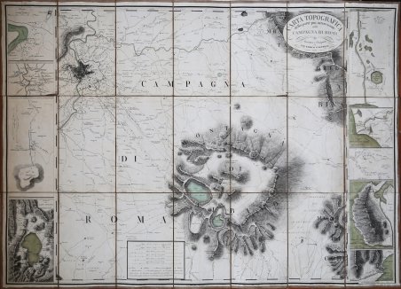 Carta della Campagna Romana allegata alla ' Guida per la Campagna di Roma. La carta è graduata ma senza l'indicazione dell'orientamento. Ricca è l'idrografia e la toponomastica. L'orografia è rappresentata secondo il nuovo metodo che ne è la parte più caratteristica. Ai lati 9 cartine orientate con le rispettive scale grafiche. A sinistra: Ostia antica, Roma. Tuscolo, lago di Fucino. A destra: ' Portus Augusti, Ostia e Tor Paterno, Veio, Circeo ossia Monte Felice, Terracina e dintorni. Al centro targa con 6 scale grafiche e spiegazione dei segni convenzionali. “Carta graduata, senza l'indicazione dell'orientazione; l'idrografia e la toponomastica sono ricche; l'orografia, delineata secondo il nuovo metodo, è la parte più caratteristica della carta anche se l'autore ha esagerato nel delineare le creste dei monti e delle colline. La carta ha ai due lati 9 cartine particolari orientate, con le rispettive scale grafiche. A sinistra: Ostia Antica, Roma, Tuscolo, lago Fucino; a destra: Porto, Porto d'Ostia e Tor Paterno, Veio, Circeo ossia Monte S. Felice; Terracina e dintorni. In alto a destra: titolo con nome dell'autore e l'anno di pubblicazione; in basso: targa con sei scale grafiche e spiegazione dei segni convenzionali. Al centro del margine inferiore: Vendesi nel negozio Scudellari. Via Condotti n. 19 e 20. A destra, sotto la cartina di Terracina e dintorni, sottoscrizione dell'incisore: Gio. Batt. Cipriani la incise, e scrisse. Roma 1827” (cfr. Frutaz, ' Le carte del Lazio, I, LVI). Johann Heinrich Westphal è stato un astronomo tedesco nativo di Schwerin. La sua carriera professionale è stata trascorsa principalmente in Italia. Acquaforte, impressa su carta vergata coeva, suddivisa in 21 segmenti ed applicata su tela coeva, più volte ripiegata ad astuccio. Coloritura coeva dei contorni, in buono stato di conservazione. Bibliografia A. P. Frutaz, ' Le carte del Lazio, I, LVI, Roma 1972, p. 122. ' Carta della Campagna Romana allegata alla ' Guida per la Campagna di Roma. La carta è graduata ma senza l'indicazione dell'orientamento. Ricca è l'idrografia e la toponomastica. L'orografia è rappresentata secondo il nuovo metodo che ne è la parte più caratteristica. Ai lati 9 cartine orientate con le rispettive scale grafiche. A sinistra: Ostia antica, Roma. Tuscolo, lago di Fucino. A destra: ' Portus Augusti, Ostia e Tor Paterno, Veio, Circeo ossia Monte Felice, Terracina e dintorni. Al centro targa con 6 scale grafiche e spiegazione dei segni convenzionali. “Carta graduata, senza l'indicazione dell'orientazione; l'idrografia e la toponomastica sono ricche; l'orografia, delineata secondo il nuovo metodo, è la parte più caratteristica della carta anche se l'autore ha esagerato nel delineare le creste dei monti e delle colline. La carta ha ai due lati 9 cartine particolari orientate, con le rispettive scale grafiche. A sinistra: Ostia Antica, Roma, Tuscolo, lago Fucino; a destra: Porto, Porto d'Ostia e Tor Paterno, Veio, Circeo ossia Monte S. Felice; Terracina e dintorni. In alto a destra: titolo con nome dell'autore e l'anno di pubblicazione; in basso: targa con sei scale grafiche e spiegazione dei segni convenzionali. Al centro del margine inferiore: Vendesi nel negozio Scudellari. Via Condotti n. 19 e 20. A destra, sotto la cartina di Terracina e dintorni, sottoscrizione dell'incisore: Gio. Batt. Cipriani la incise, e scrisse. Roma 1827” (cfr. Frutaz, ' Le carte del Lazio, I, LVI). Acquaforte, impressa su carta vergata coeva, suddivisa in 21 segmenti ed applicata su tela coeva, più volte ripiegata ad astuccio. Coloritura coeva dei contorni, in buono stato di conservazione. Bibliografia A. P. Frutaz, ' Le carte del Lazio, I, LVI, Roma 1972, p. 122. Cfr.
