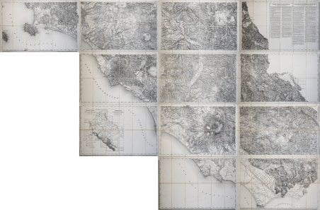 Grande carta del Lazio in 12 fogli, stampata a Vienna dal K.K.Militärisches Geographisches Institut ' (Istituto Geografico Militare Austriaco) nel 1851. DIsegnata da Giovanni Marieni. I dodici fogli che raffigurano l’intero Lazio sono parte della più grande Carta Topografica dello Stato Pontificio e del Gran-Ducato di Toscana construtta sopra misure astronomico trigonometriche ed incisa sopra pietra a Vienna = Topographische Karte des Kirchenstaates und des Großherzogthums Toscana: nach astronomisch trigonometrischen Vermessungen bearbeitet und auf Stein gestochen zu Wien. La celebre carta, realizzata dal K.K.Militärisches Geographisches Institut, venne edita per gli Stati dell'Italia centrale (Granducato di Toscana e Stato Pontificio) nel 1851 in 52 fogli (scala di 1:86.400), Cartograficamente si basa sulle carte catastali e su regolari triangolazioni eseguita nel 1840-43 dall'ingegnere Giovanni Marieni per lo Stato Pontificio e sui precedenti rilevamento di Giovanni Inghirami per il Granducato. Mostra gli abitati (distinti per importanza, i boschi, i prati e pascoli, gli oliveti, le risaie, le saline, le paludi, le strade di prima e seconda classe con le provinciali e le comunali, la viabilità minore, le ferrovie, gli acquedotti, i confini. L'orografia è resa a tratteggio. La carta è corredata di un quadro di unione, da notizie geografiche, storiche e statistiche, da valori di altitudine e di coordinate. I centri abitati sono geograficamente ben posizionati grazie all'utilizzo dei punti trigonometrici. La rete ferroviaria in fase di progetto e di esecuzione è già tracciata. La carta si compone di 52 fogli che non seguono una numerazione continua e sono contrassegnati da una lettera maiuscola seguita da un numero arabo. Frutaz riproduce i soli fogli che riguardano il Lazio. La carta venne riprodotta in autografia nel 1860 dall'Ufficio topografico del Corpo Reale di Stato Maggiore di Torino dal titolo Carta topografica dell'Italia centrale alla scala 86.400 (Biblioteca della Società Geografica Italiana, Villa Celimontana, E. 2, III; B.M. Catalogue, VII, col. 1104) e in fotolitografia nel 1878 ingrandita al 75.000 dall'Istituto Topografico Militare dal titolo Carta topografica della Lombardia, del Veneto e dell'Italia Centrale, alla scala di 1 a 75.000. Un esemplare completo della carta è conservato all’Università di Vienna. https://goobi-viewer.univie.ac.at/viewer/toc/AC03849379/1/ Litografia, dodici fogli tagliati ed applicati su tela coeva, più volte ripiegata ad astuccio, leggere ossidazioni, per il resto in ottimo stato di conservazione. Bellissimo esemplare di questa assai rara carta geografica, con Ex-libris della libreria di Giovan Battista Maggi di Roma e Torino al verso di ciascun foglio e anche dell’astuccio. Probabile che il Maggi vendesse la carta nei singoli fogli e colui che l’acquistò fosse solo interessato alla parte riguardante il Lazio, che si fece racchiudere in astuccio. La carta non forma un classico rettangolo; la parte superiore si compone di 4 fogli (che misurano circa 3 metri) e si estende ad ovest fino a comprendere quasi interamente l’isola del Giglio. Due fila di “righe” centrali sono composte da 3 fogli ciascuna per una misura di 2250 mm; nella riga inferiore, a sinistra, troviamo il “Foglio d’insieme” di tutta la carta. La parte inferiore è composta da soli due fogli (1500 mm). L’ingombro totale della carta è di circa 3x1,86 metri. ' “È capitato altre volte, sfogliando queste pagine, di incontrare esemplari dalle dimensioni generose, a volte persino molto grandi. Incontri non casuali, ma scelti in ragione del materiale disponibile. Qui però siamo di fronte a un vero e proprio gigante cartografico, la cui presenza in queste pagine ha richiesto tutta l'abilità e la pazienza del grafico e del fotografo e la comprensiva disponibilità dell'editore. Avete letto bene le dimensioni, siamo infatti in presenza di una superficie di stampa di 20,. Grande carta del Lazio in 12 fogli, stampata a Vienna dal K.K.Militärisches Geographisches Institut (Istituto Geografico Militare Austriaco) nel 1851. I dodici fogli che raffigurano l’intero Lazio sono parte della più grande ' Carta Topografica dello Stato Pontificio e del Gran-Ducato di Toscana construtta sopra misure astronomico trigonometriche ed incisa sopra pietra a Vienna = Topographische Karte des Kirchenstaates und des Großherzogthums Toscana: nach astronomisch trigonometrischen Vermessungen bearbeitet und auf Stein gestochen zu Wien. La celebre carta, realizzata dal K.K.Militärisches Geographisches Institut, venne edita per gli Stati dell'Italia centrale (Granducato di Toscana e Stato Pontificio) nel 1851 in 52 fogli (scala di 1:86.400), Cartograficamente si basa sulle carte catastali e su regolari triangolazioni eseguita nel 1840-43 dall'ingegnere Giovanni Marieni per lo Stato Pontificio e sui precedenti rilevamento di Giovanni Inghirami per il Granducato. Mostra gli abitati (distinti per importanza, i boschi, i prati e pascoli, gli oliveti, le risaie, le saline, le paludi, le strade di prima e seconda classe con le provinciali e le comunali, la viabilità minore, le ferrovie, gli acquedotti, i confini. L'orografia è resa a tratteggio. La carta è corredata di un quadro di unione, da notizie geografiche, storiche e statistiche, da valori di altitudine e di coordinate. I centri abitati sono geograficamente ben posizionati grazie all'utilizzo dei punti trigonometrici. La rete ferroviaria in fase di progetto e di esecuzione è già tracciata. La carta si compone di 52 fogli che non seguono una numerazione continua e sono contrassegnati da una lettera maiuscola seguita da un numero arabo. Frutaz riproduce i soli fogli che riguardano il Lazio. La carta venne riprodotta in autografia nel 1860 dall'Ufficio topografico del Corpo Reale di Stato Maggiore di Torino dal titolo ' Carta topografica dell'Italia centrale alla scala 86.400 ' (Biblioteca della Società Geografica Ital