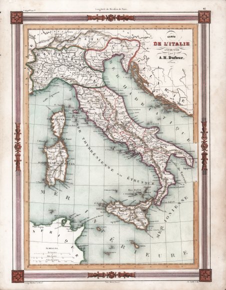 Mappa preparata da Auguste Henri Dufour per essere pubblicata nell'edizione del 1848 dell'Atlas Illustre pubblicato dalla casa editrice Maison Basset. La Maison Basset (1819 - 1865) è stata un'azienda editoriale francese attiva nella metà e nella fine del XIX secolo, fondata da André Basset (o Bassett), che iniziò a pubblicare mappe, stampe e libri intorno al 1768. La Maison Basset, o Chez Basset, è il marchio con cui gli eredi di Paul-André Basset (1785-1819) pubblicarono le opere di importanti cartografi e incisori francesi come Barbie du Bocage, A. Vuillemin, J. B. Charle, V. Levasseur, Tu. Duvotenay, H. Dufor, F. E. George e altri. La loro biblioteca di pubblicazioni è varia e vasta, ma fortemente incentrata su testi medici e scientifici, tra cui alcuni importanti atlanti. Auguste Henri Dufour, nato a Parigi nel 1795 e morto nel 1865, è stato un geografo francese. Dufour ha studiato con Emile Lapie e ha lavorato con lui su diverse mappe per il Depot de la Marine. Ha collaborato con numerosi altri cartografi, editori e incisori del periodo compreso Dyonnet e Duvotenay. Il suo corpus comprende numerose mappe e atlanti, il più eclatante dei quali è probabilmente il suo monumentale Grand atlas Universel physique, historique et politique geographie ancienne et moderne del 1857. Incisione in rame con contorno originale a colori, alcune ossidazioni, per il resto buono stato di conservazione. Map prepared by Auguste Henri Dufour for publication in Maison Basset's 1848 edition of ' Atlas Illustre Destine a l'enseignement de la Geographie elementaire. Maison Basset (1819 - 1865) was a French publishing concern active through the mid to late 19th century. The firm can trace their roots to André Basset (or Bassett) (fl. 1768 - 1784), who starting publishing maps, prints, and books around 1768. Maison Basset, also Chez Basset, is the imprint under which the heirs of Paul-André Basset (1785 - 1819) published the works of such prominent French cartographers and engravers as Barbie du Bocage, A. Vuillemin, J. B. Charle, V. Levasseur, Tu. Duvotenay, H. Dufor, F. E. George, and others. Their library of publications is diverse and vast, but heavily focused on medical and scientific texts, including several important atlases. Adolphe Hippolyte Dufour (1798 - 1865), also known as Auguste-Henri Dufour, was a Paris based map and atlas publisher active in the mid to late 19th century. Dufour claimed to be a student of another French cartographer, Emile Lapie. His is known to have worked with numerous other cartographers, publishers and engravers of the period including Dyonnet and Duvotenay. His corpus includes numerous maps and atlases, the most striking of which is probably his monumental 1857 elephant folio Grand atlas Universel physique, historique et politique geographie ancienne et moderne. Copper engraving with original outline colour, some foxing, otherwise good condition. Cfr.