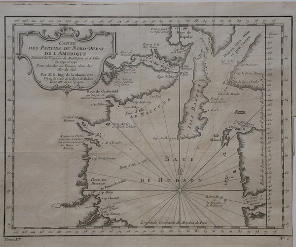 Carta disegnata da Jacques Nicolas Bellin, pubblicata come tavola dell'edizione francese del 1757 di "Histoire generale des voyages, ou nouvelle collection de toutes les relations de voyages par mer et par terre s" di Antoine François Prévost, più noto sotto il nome di abbé Prévost. La raccolta, in più volumi, è stampata per la prima volta A Paris: chez Didot, 1746-1753.L’opera completa - in-12° - proseguirà le pubblicazioni fino a raggiungere, nel 1789, una consistenza di 80 volumi. Colossale lavoro a carattere enciclopedico di ricerca svolto dall’Autore, cui va anche il merito di aver divulgato numerosi racconti inediti sulla scoperta dell’Australia da parte degli olandesi e i resoconti dei viaggi attraverso il Pacifico, fra cui quelli di Magellano e Schouten. L'opera è corredata da quasi 300 illustrazioni di popolazioni, vedute, e costumi di tutto il mondo e da 113 splendide mappe, opera di Jaques-Nicolas Bellin. Jacques-Nicolas Bellin è stato uno dei cartografi più importanti del XVIII secolo; nacque a Parigi, e fu un membro dell’Académie de Marine e della Royal Society di Londra. Nel 1721, all’età di 18 anni, fu nominato idrografo (cartografo capo) alla Marina Militare francese. Nell’agosto del 1741, divenne il primo Ingénieur de la Marine del Depot des cartes et plans et de la Marine (l’ufficio idrografico francese) e fu nominato ufficiale idrografico del Re di Francia. Durante il suo servizio gli furono commissionati i rilievi delle coste francesi prima, e successivamente quelle di tutto il mondo conosciuto. La sua produzione fu immensa e le sue carte nautiche, di grande qualità, apparvero in più edizioni oltre la fine del diciottesimo secolo. Le carte nautiche venivano vendute separatamente e recavano tutte l’inconfondibile timbro dell’ancora e la corona del Depot Generale de la Marine. Incisione in rame, in ottime condizioni. Very nicely engraved chart that covers most of Hudson's Bay. Locates Fort Prince of Wales and Fort York, the Ottawa Islands (here the Bakers Dozen), the track of Henry Ellis in 1746, and more.Map drawn by Jacques Nicolas Bellin, published as a plate of the French edition of 1757 of "Histoire General des Voyages, ou nouvelle collection de toutes les relations de voyages par mer et par terre s" by Antoine François Prévost, better known under the name of abbé Prévost.The collection, in several volumes, is printed for the first time A Paris: chez Didot, 1746-1753.The complete work - in 12th - will continue the publications until it reaches, in 1789, a consistency of 80 volumes. A colossal encyclopedic research work carried out by the author, which also deserves credit for having published numerous unpublished stories about the discovery of Australia by the Dutch and reports of journeys across the Pacific, including those of Magellan and Schouten.The work is accompanied by nearly 300 illustrations of populations, views, and costumes from around the world and by 113 splendid maps, by Jaques-Nicolas Bellin. Bellin was one of the most important cartographers of the 18th century; he was born in Paris, and was a member of the Académie de Marine and the Royal Society of London. In 1721, at the age of 18, he was appointed hydrographer (chief cartographer) to the French Navy. In August 1741, he became the first Ingénieur de la Marine of the Depot des cartes et plans et de la Marine (the French hydrographic office) and was appointed hydrographic officer to the King of France. During his service he was commissioned to survey first the French coastline and later those of the entire known world. His output was immense, and his high-quality nautical charts appeared in multiple editions beyond the end of the 18th century. ' Copperplate, in good conditions. Cfr.