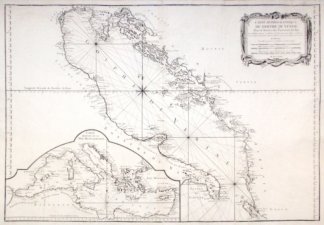Incisione in rame, 581x870.<BR>Carta nautica dell'Adriatico. Nell'angolo inferiore sinistro è riportata una carta ridotta del Mediterraneo. Bell'esemplare con piega editoriale, qualche piccola traccia di tarlo restaurata e uno strappo restaurato.<BR>
