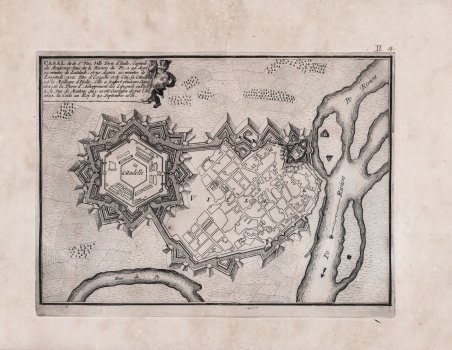 Carta geografica tratta da ' Les forces de l’Europe ou description des principals villes… ' Paris: Chez l'Auteur, 1693-1696 ' celebre raccolta composta da otto parti in un volume, in folio oblungo. Les Forces de l’Europe ' è un noto atlante militare francese; prevalentemente si tratta di mappe, piani e vedute di fortificazioni di città europee in Francia, Germania e Paesi Bassi, l'atlante include anche una serie di altre regioni, tra cui Malta, Costantinopoli, Tripoli e altrove. Nicolas de Fer (1646-1720) è stato uno dei più grandi cartografi, incisori ed editori del XVII secolo. Il padre, Antoine de Fer, era un modesto mercante di stampe che lavorava sull’Ile del la Cité a Parigi; collaborò con Nicolas I Berey, poi con Melchior Tavernier e, quindi, con Jacques Lagnet. Nel 1652 Antoine adotta l’insegna commerciale della “Sphére royale”, già appartenuta a Tavernier; nel 1657 stampa ' Cartes de géographie, una piccola raccolta tascabile di Pierre Duval. Nel 1667 si firmava “merchand de cartes Gèographique”; proseguì l’attività fino al 1686, quando lasciò la tipografia nelle mani del figlio Nicolas, che aveva fatto da apprendista all’incisore parigino Louis Spirinx e aveva già realizzato la sua prima mappa del Canal du Midi, all’età di soli 23 anni. Nel 1689 realizzò una mappa della Franche-Comté per onorare il Grand Dauphine - Luigi di Francia (1661-1711), primogenito ed erede del re Luigi XIV di Francia, impegnato al comando di una campagna di conquistare di nuovi territori sul Reno. In seguito, venne nominato geografo ufficiale del Delfinato e la sua produzione fu strettamente legata agli interessi della corona francese: ad esempio, ' Forces De L’Europe Ou Introduction A La Fortification, pubblicato nel 1695, che mostrava le nuove fortificazioni progettate dall’innovativo ingegnere francese Sébastien de Vauban. Fu il geografo ufficiale anche di Filippo V e Luigi XIV (entrambi i rami francese e spagnolo della Casa di Borbone) e infine, nel 1720, del Papa. De Fer pubblicò l’Atlas curieux où le Monde représenté dans les cartes générales et particulièrs du Ciel et de ' la Terre ' tra il 1700 e il 1705, aggiungendo ogni volta delle nuove tavole geografiche. La sua opera più maestosa rimane l’Atlas Royal, dans l’Isle du Palais sur le Quay de l'Orloge a la Sphere royale ' (1693). Alla sua morte, l’attività fu ereditata da suo genero Guillaume Danet, che si unì poi con Jacques-François Benard. Acquaforte, in buono stato di conservazione. Map from ' Les forces de l'Europe ou description des principals villes ' . Paris: Chez l'Auteur, 1693-1696 ' famous collection consisting of eight parts in one volume, oblong folio. Les Forces de l'Europe ' is a well-known French military atlas; predominantly maps, plans and views of fortifications of European cities in France, Germany and the Netherlands, the atlas also includes a number of other regions, including Malta, Constantinople, Tripoli and elsewhere. Nicolas de Fer (1646-1720) was one of the greatest cartographers, engravers and publishers of the 17th century. His father, Antoine de Fer, was a modest print merchant working on the Ile del la Cité in Paris; he collaborated with Nicolas I Berey, then with Melchior Tavernier, and then with Jacques Lagnet. In 1652 Antoine adopted the "Sphére royale" trade sign, which had already belonged to Tavernier; in 1657 he printed ' Cartes de géographie, a small pocket collection by Pierre Duval. In 1667 he signed himself "merchand de cartes Gèographique"; he continued the business until 1686, when he left the print shop in the hands of his son Nicolas, who had been apprenticed to Parisian engraver Louis Spirinx and had already made his first map of the Canal du Midi, at the age of only 23. In 1689 he made a map of Franche-Comté to honor the Grand Dauphine - Louis of France (1661-1711), eldest son and heir of King Louis XIV of France, who was engaged in commanding a campaign to conquer new territories on the Rhine. He was later appointed official geographer of the Dauphiné, and his output was closely linked to the interests of the French crown: for example, ' Forces De L'Europe Ou Introduction A La Fortification, published in 1695, which showed the new fortifications designed by the innovative French engineer Sébastien de Vauban. He was also the official geographer of Philip V and Louis XIV (both the French and Spanish branches of the House of Bourbon) and finally, in 1720, of the Pope. De Fer published theAtlas curieux où le Monde représenté dans les cartes générales et particulièrs du Ciel et de la Terre ' between 1700 and 1705, adding new geographical plates each time. His most majestic work remains the ' Atlas Royal, dans l'Isle du Palais sur le Quay de l'Orloge a la Sphere royale ' (1693). Upon his death, the business was inherited by his son-in-law Guillaume Danet, who later joined forces with Jacques-François Benard. Etching, very good condition. Cfr.